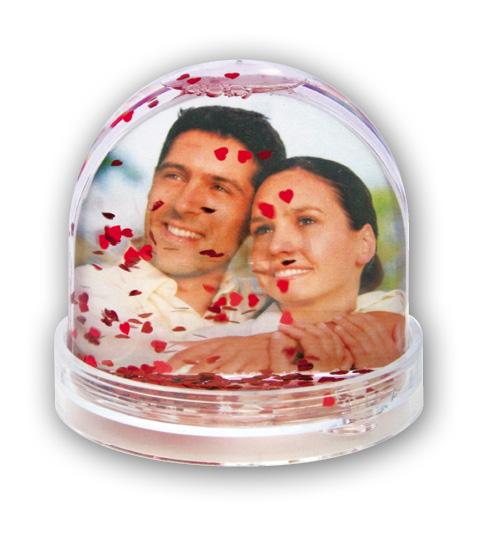 Beautiful photo globe with small hearts - a perfect gift for somebody you like. This photo globe has space for your own (double-sided) pictures with the dimensions 6.5x6.2 cm.