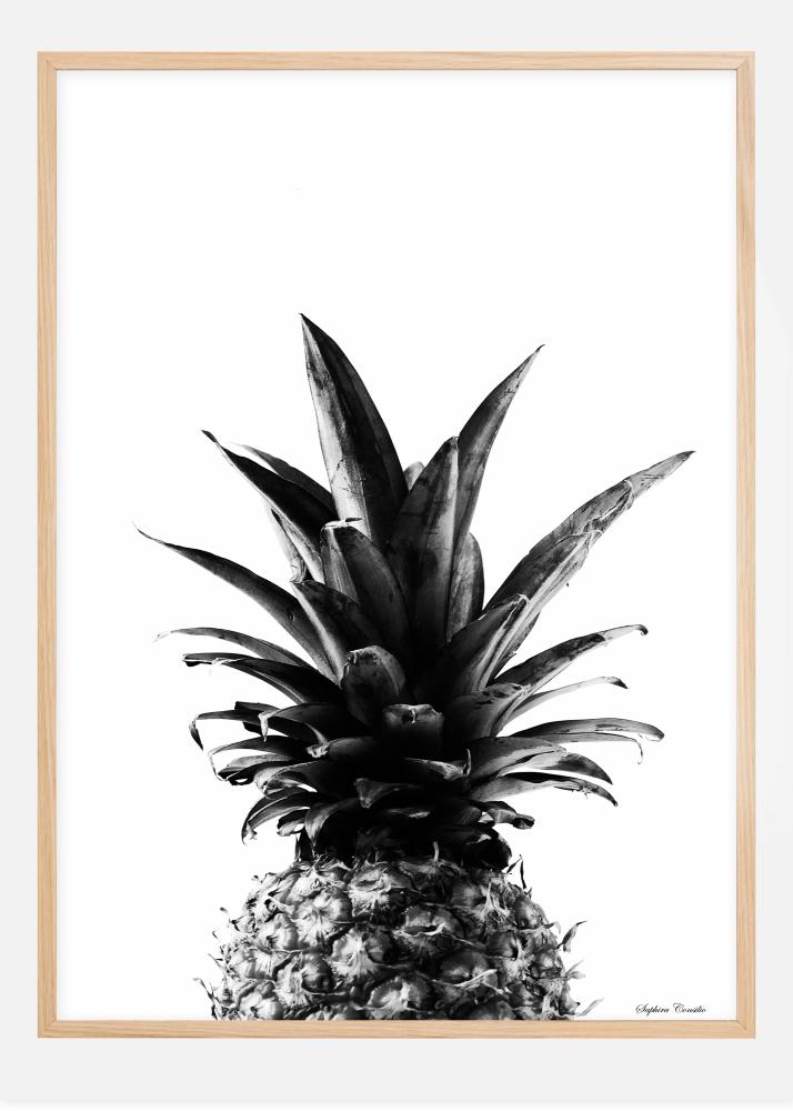 A photographic poster in black and white of a pineapple against a white background, photographed by Saphira Consilio. A sleek picture in a modern cut, easy to combine with other posters on a larger picture wall.