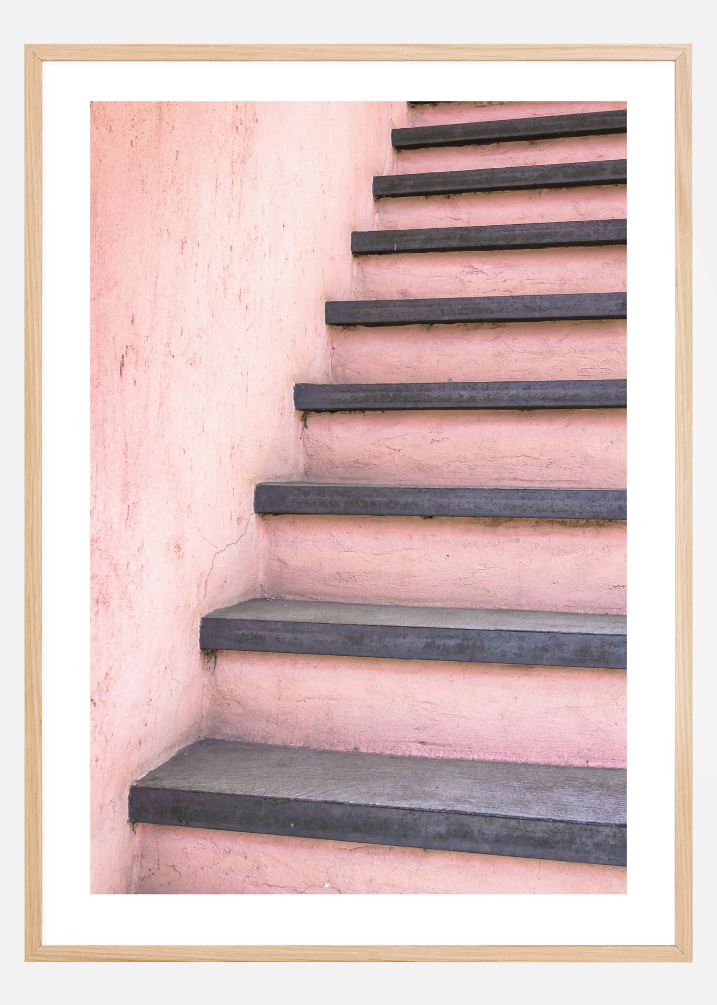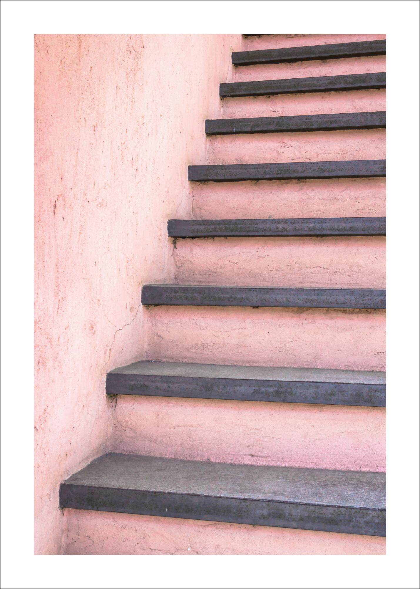 A photograph of a staircase with lovely contrasts of pink pastel and grey concrete. A simple and sleek poster, perfect to combine with other favourites on a larger picture wall. Suits most homes and interior styles.