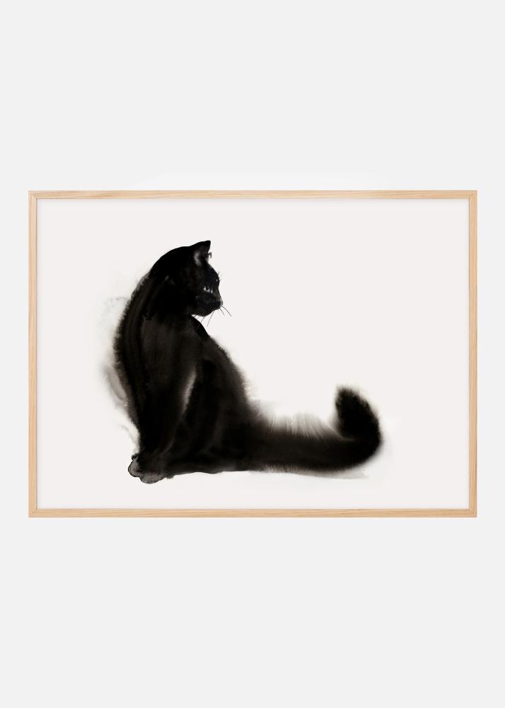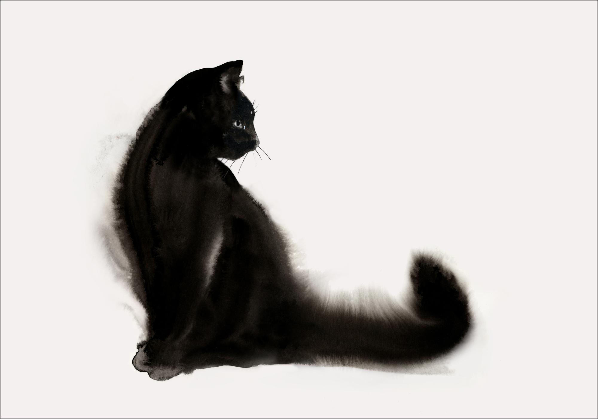 A beautiful print of a black Burmese cat. Set on a white background, the black cat looks over it shoulders as if it is observing something. The natural light shines on the cat's forelegs creating a white patch. A stunning image for cat lovers.