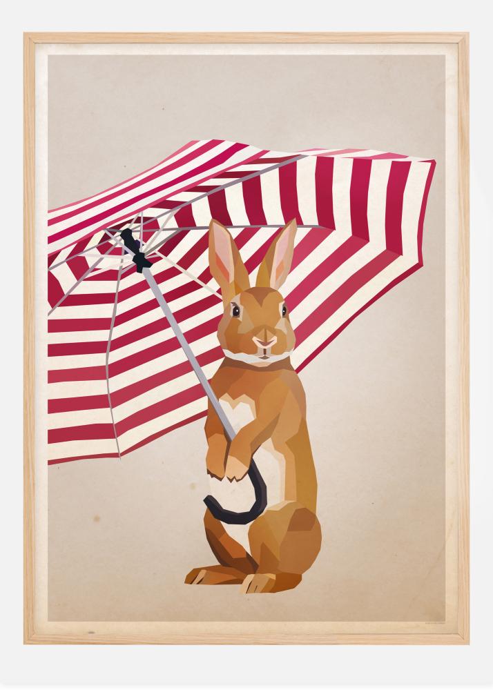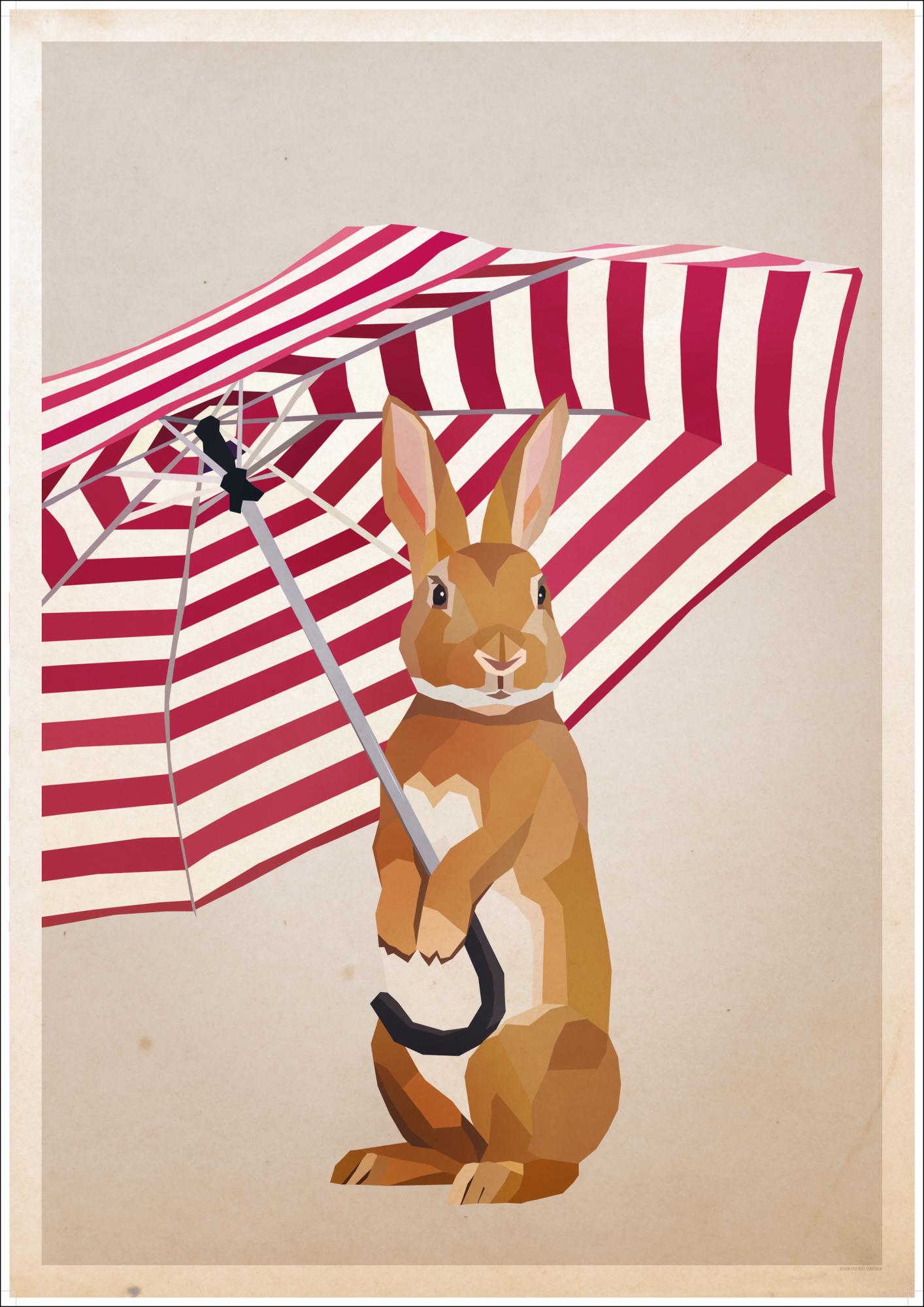 A cute work of art with a rabbit holding an umbrella between its two upper limbs. Set on a beige background, the brown and white rabbit holds a red and white umbrella. With the rabbit's eyes looking straight into the camera, this is the perfect print for your child's bedroom.