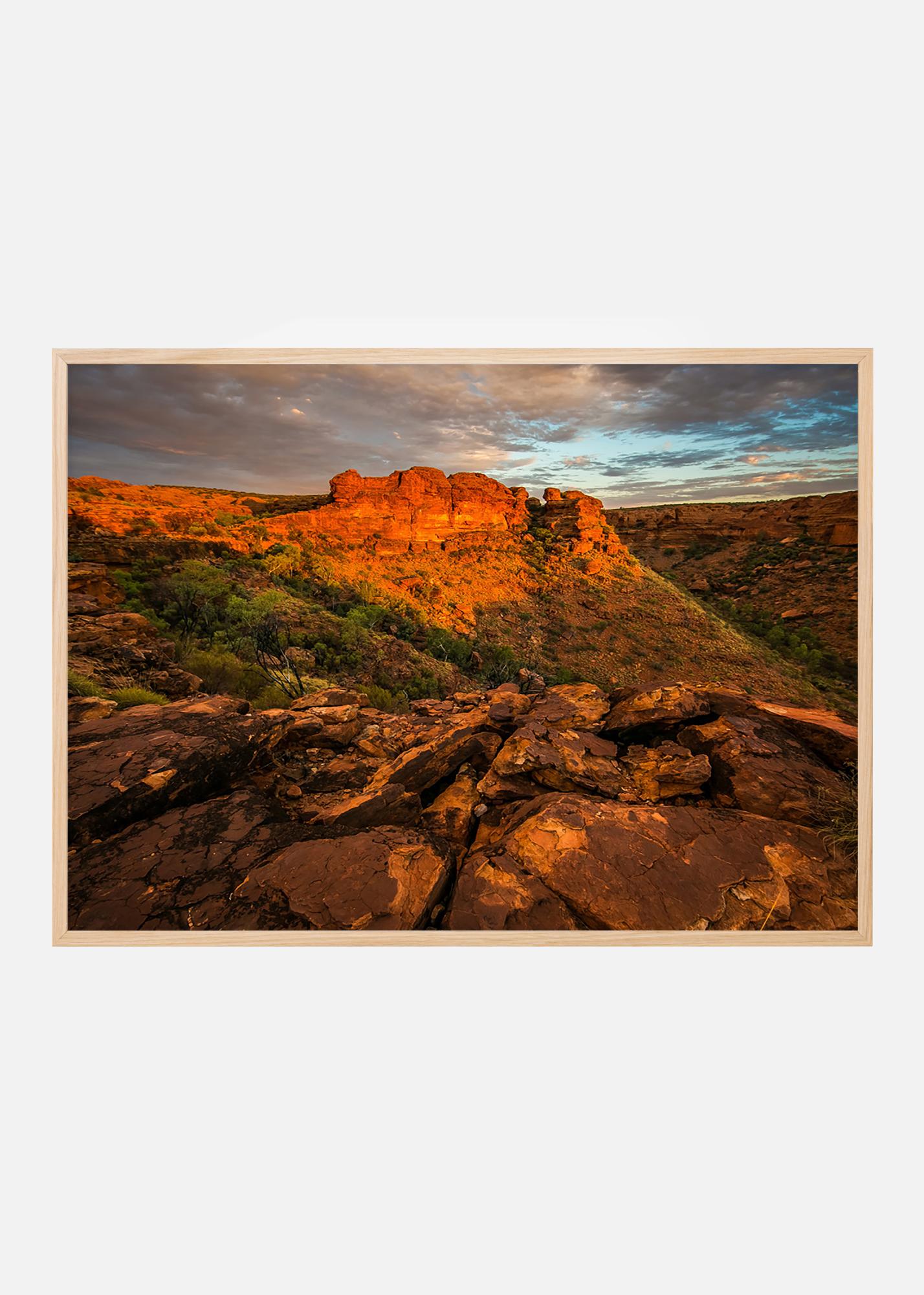 Poster with a photograph of stark red mountains at sunset, something for those who like deserts and rock formations to hang on the wall. The warm red tones against the ice blue sky and the depth in the picture create an interesting subject. Frame the poster with a stylish photo frame and place it on a picture wall along with other desert motifs.