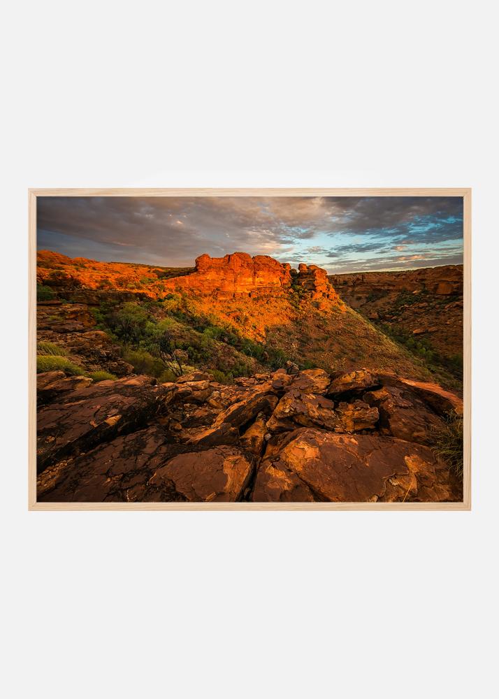 Poster with a photograph of stark red mountains at sunset, something for those who like deserts and rock formations to hang on the wall. The warm red tones against the ice-blue sky and the depth in the picture create an interesting subject. Frame the poster with a stylish photo frame and place it on a picture wall along with other desert motifs.