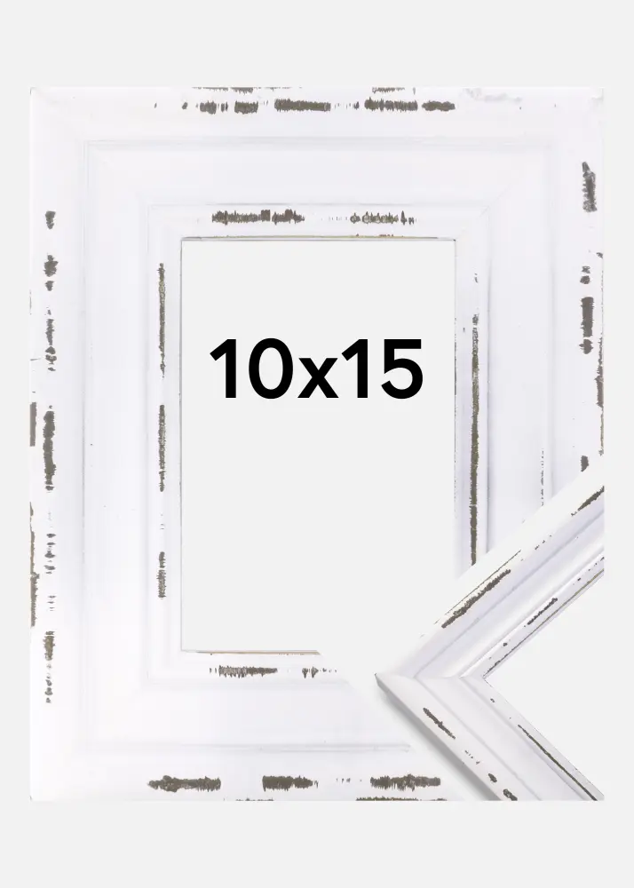 If you're not lucky enough to have inherited old framed family photographs, you can make them yourself! This is a beautiful frame with a time-worn effect that looks good with any photograph! The frame is white with classically carved edges and sanded sections through which the wood is visible. Choose from a range of different sizes!