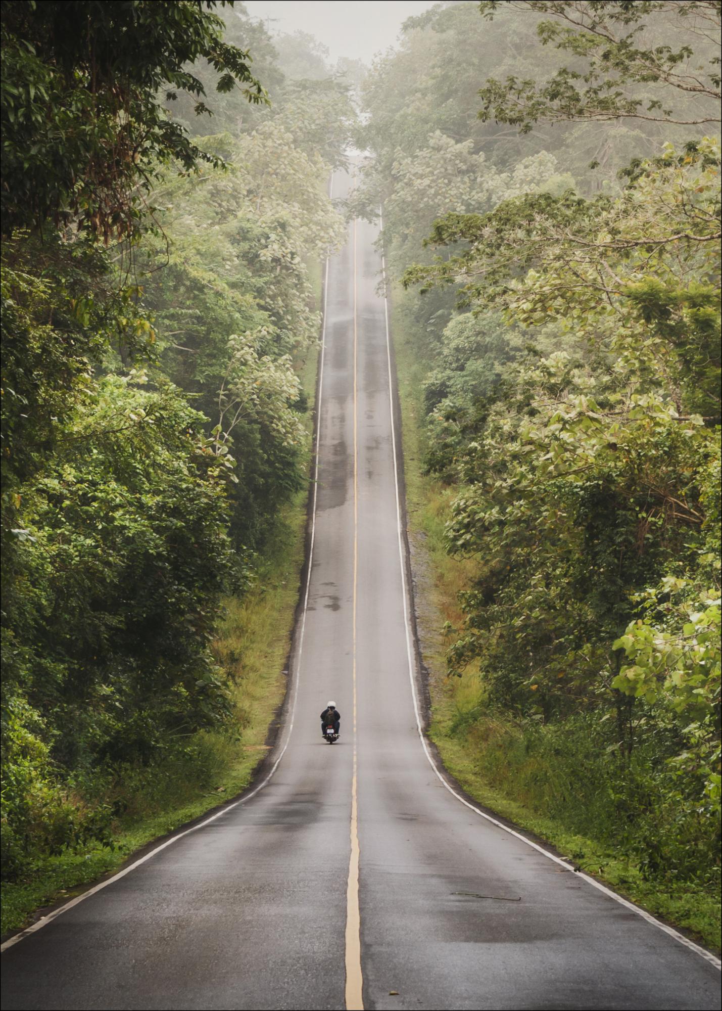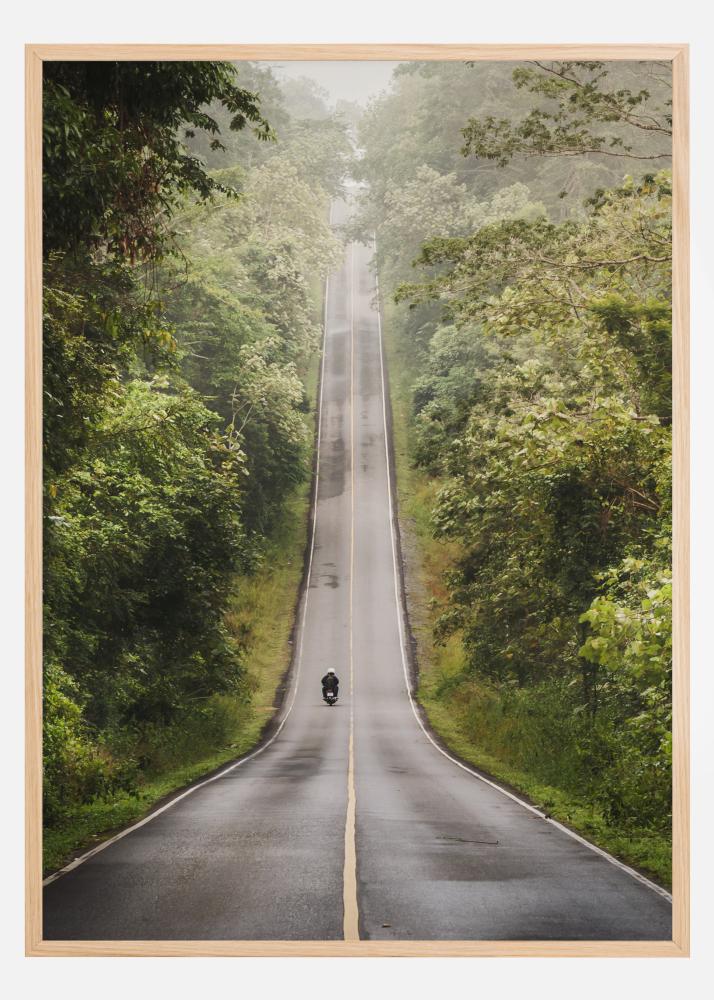 A tranquil nature photograph of a road with a lone motorcyclist cutting through wonderfully lush greenery. A calm and soothing poster that works excellently together with other favourites on a larger picture wall.
