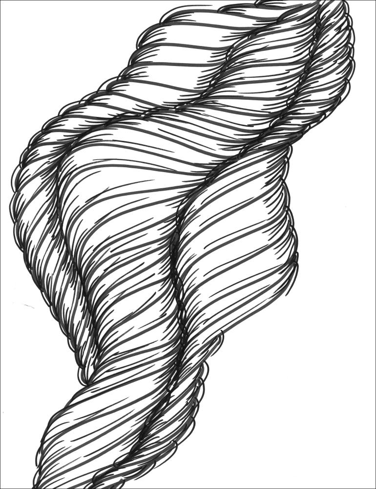 A swirling abstract poster of black lines intertwining to create the form of a tornado. Three black line spirals twist together on a white background. The thick and thin lines create an almost moving image that carries the eye as it drifts across this piece.