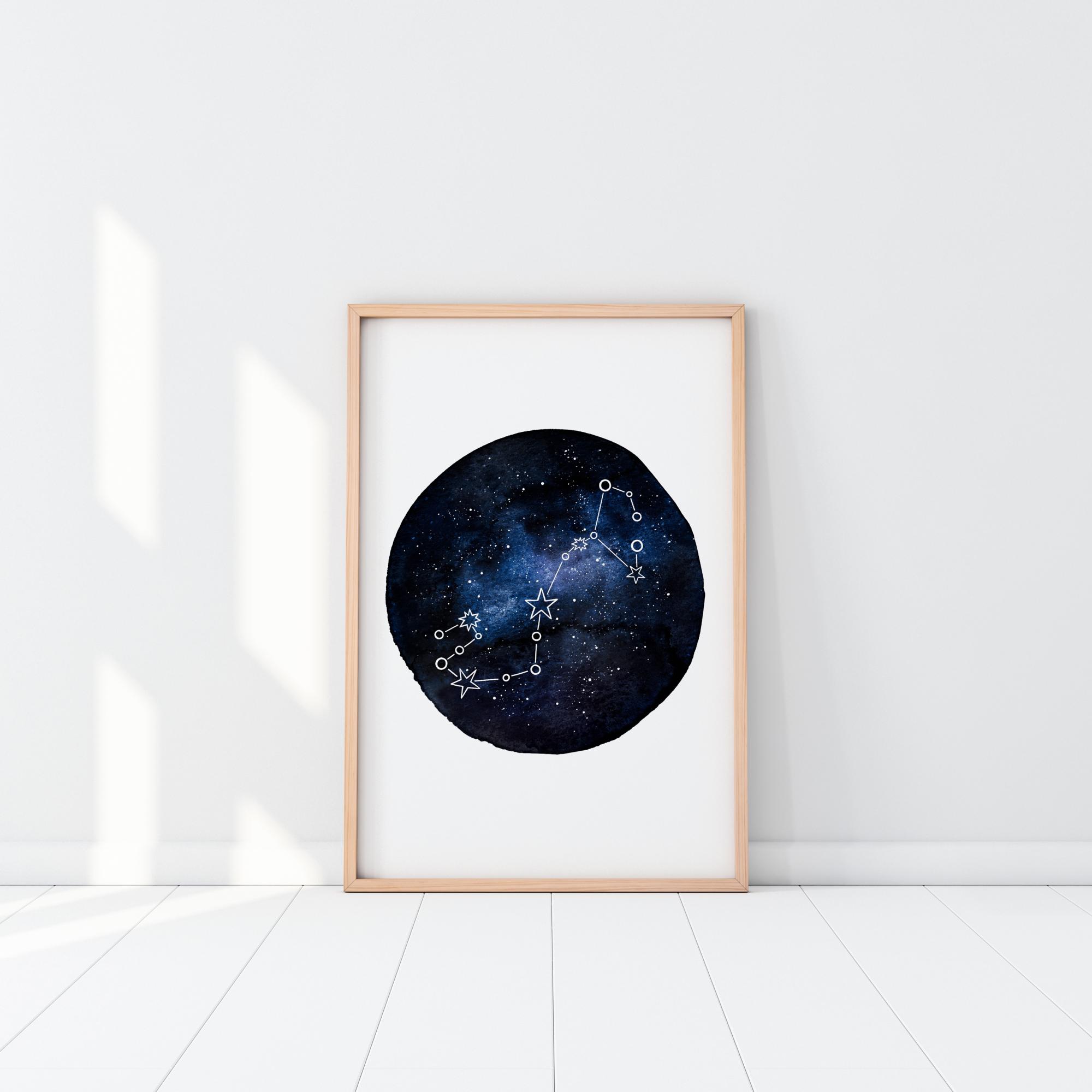 A horoscope poster of the star sign Scorpio. A large dark blue circle floats on a white background. Inside the ball is the galaxy and hundreds of different stars. Boldly across the top is the Zodiac sign for Scorpio. A perfect addition if you want to show off your star sign.