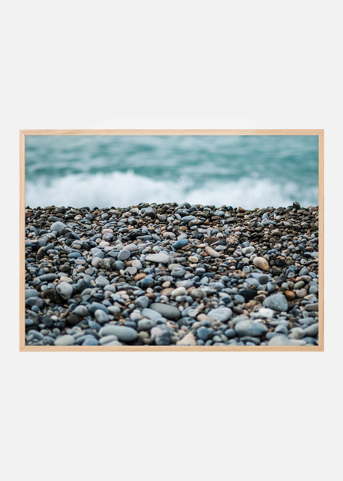 Hear the sound of the ocean waves from this poster featuring a beautiful stone beach in the foreground. The shallow depth of field creates an interesting image that draws the eyes into the picture. Can you find any rounded glass piece among the stones? The grey-blue colour scheme goes well with a slim frame against a light wall, preferably with marine accessories to complement it.
