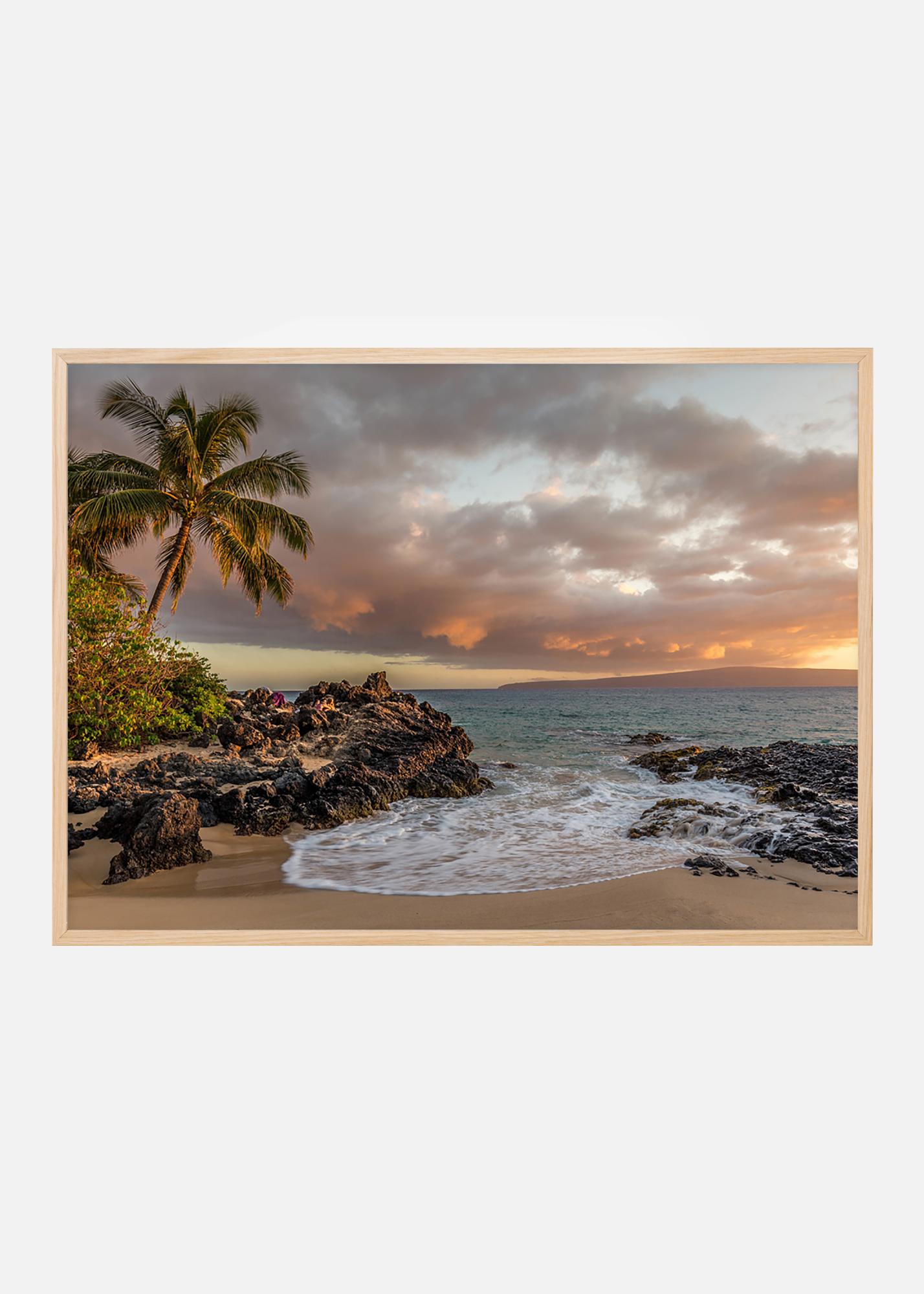 A beach at sunset, a beautiful cliché that is a must for the tiki nerd or the tropical theme. Poster with the classic palm tree leaning out over the edge of the beach in the last golden rays of the day. The photograph looks great in a picture frame with a weathered look or in a bold colour to match the tiki decor.