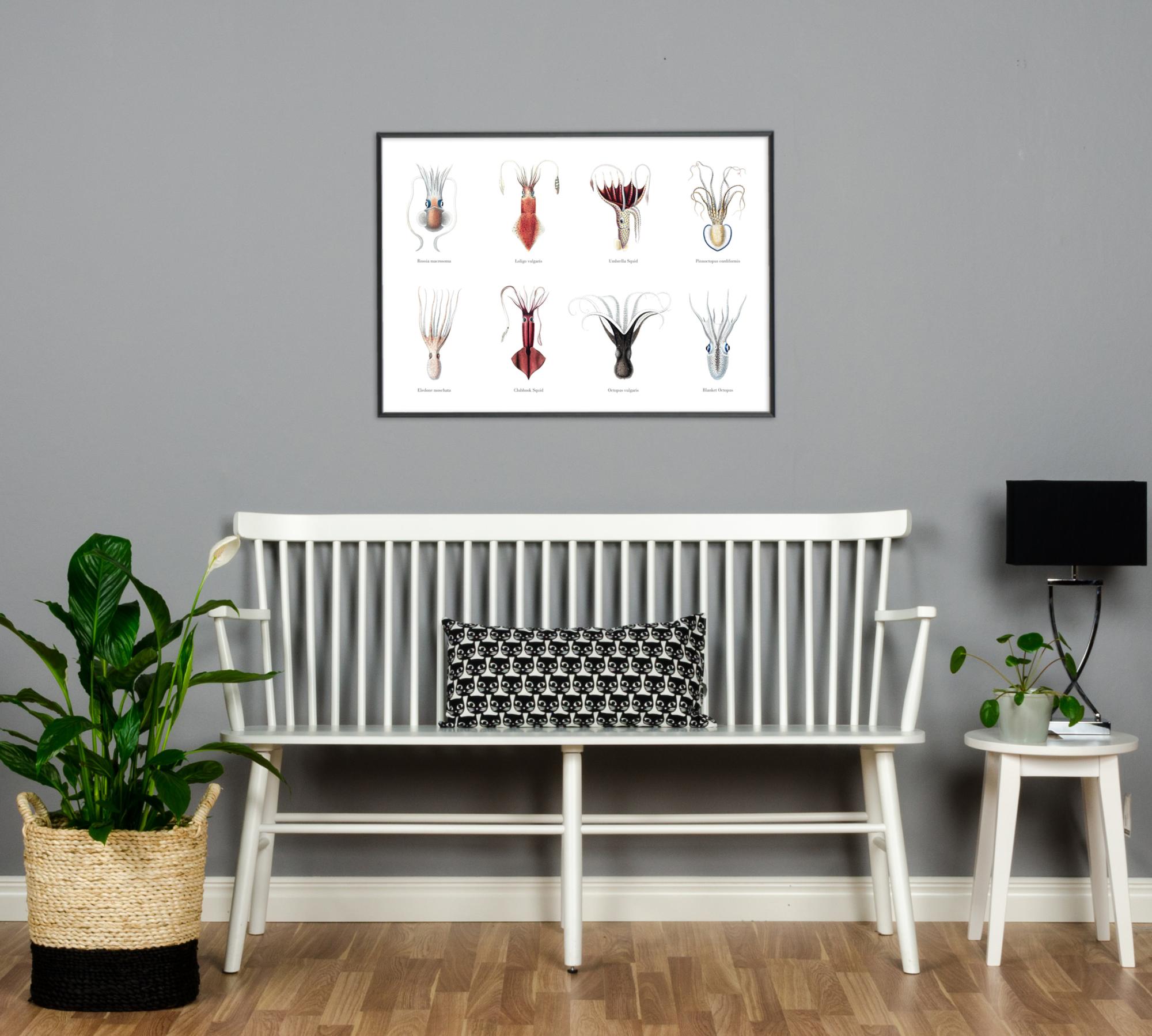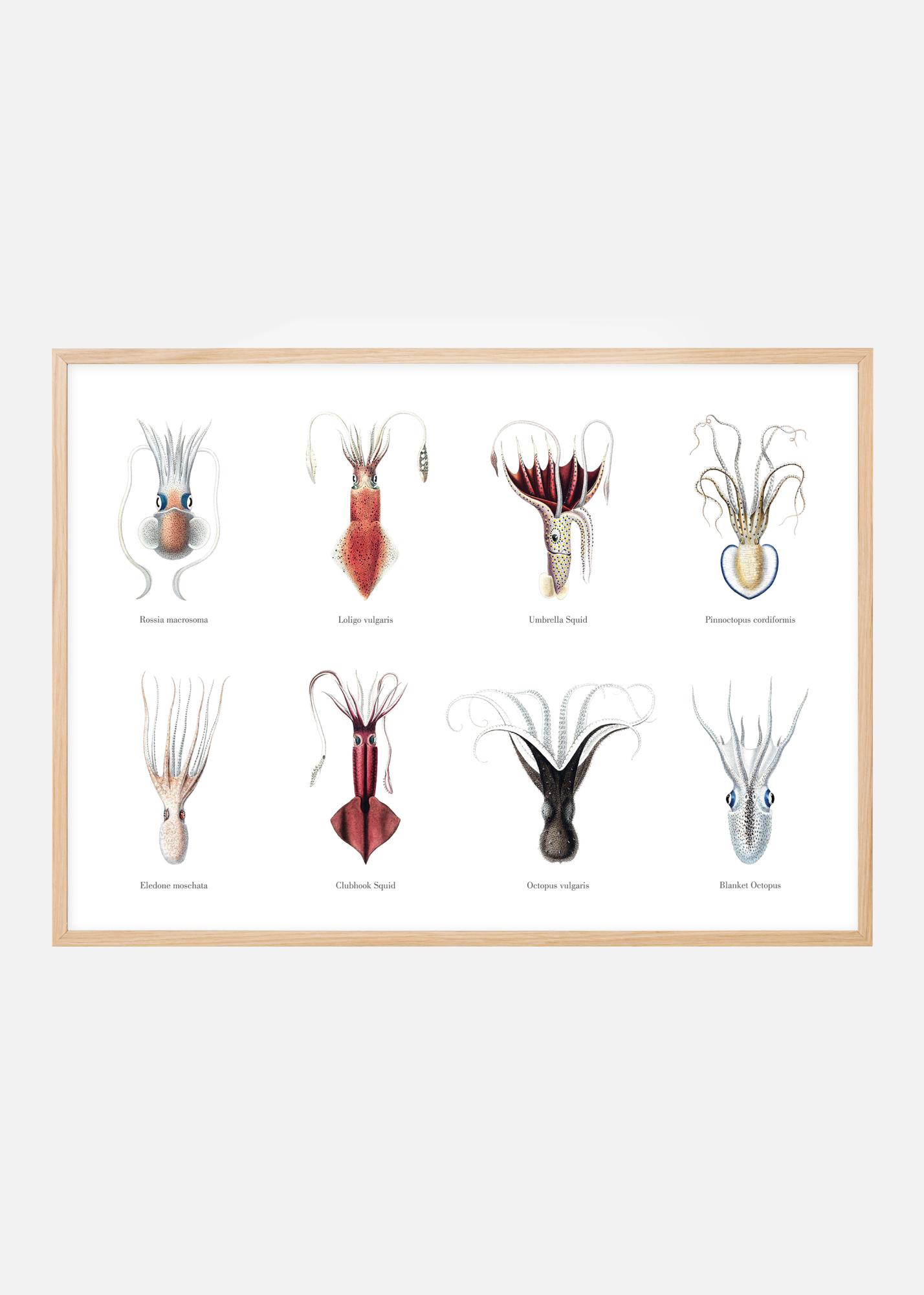 The octopus is truly an interesting creature. Did you know, for example, that it has 3 hearts? Or that its intelligent brain is tiny, despite the gigantic thing that looks like a head seeming to contain a huge brain? Furthermore, there are almost 800 species of octopus! This fine vintage poster depicts 8 of them - none alike but all equally fascinating. The old drawings have cute, well-made details and under each species, the name is stated.