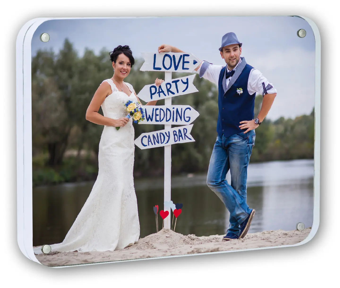 Unique double-sided photo frame with two thick, magnetic plexiglass sheets. Place your pictures between the sheets and stick them together. It couldn't be easier! Looks just as good on a bookshelf as on a table.