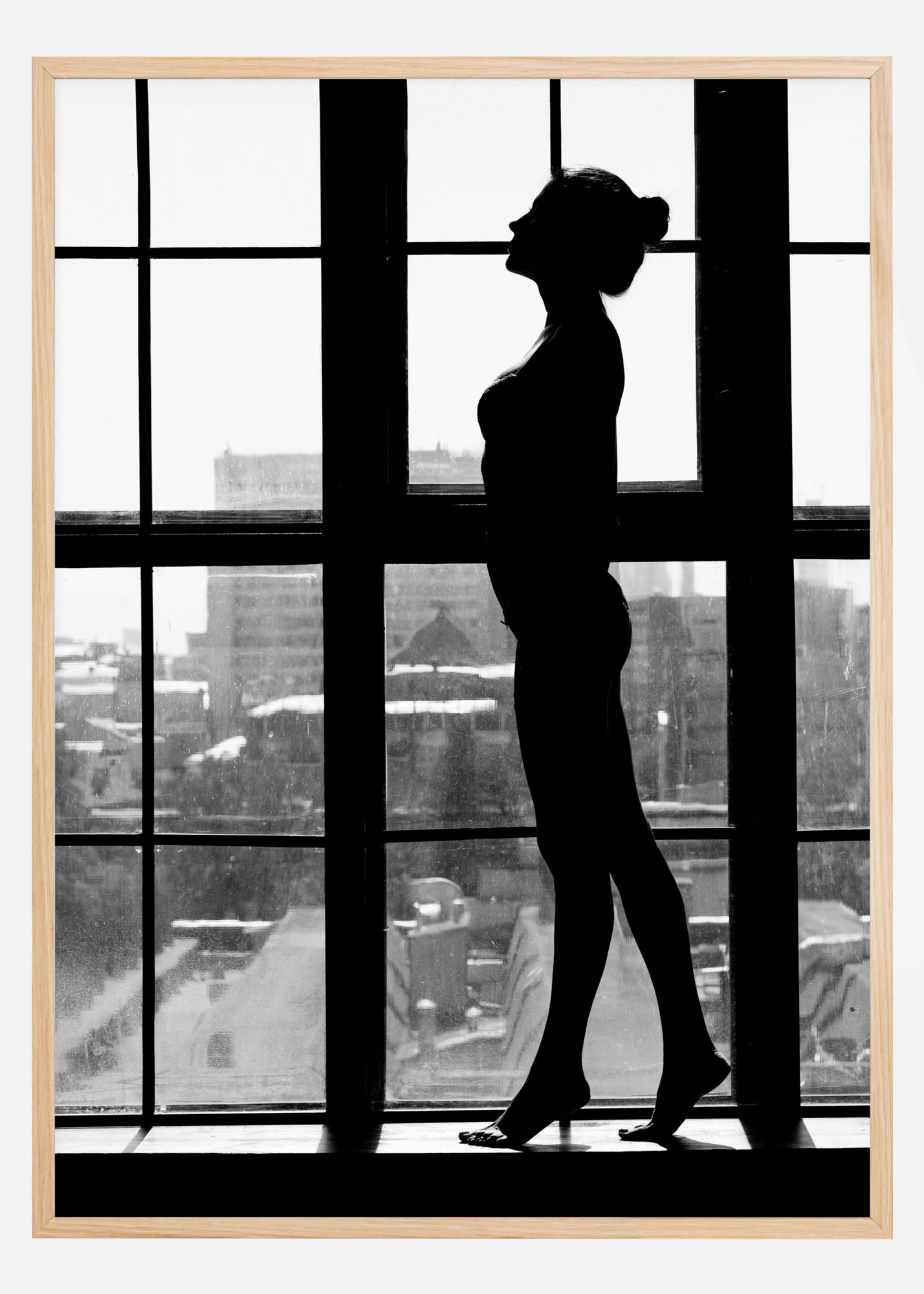 Photographic art in grayscale of a woman standing in a large industrial window. The backlight turns the woman into a dark silhouette against the city outside. A stylish poster, perfect to combine with other favourites on a larger picture wall.