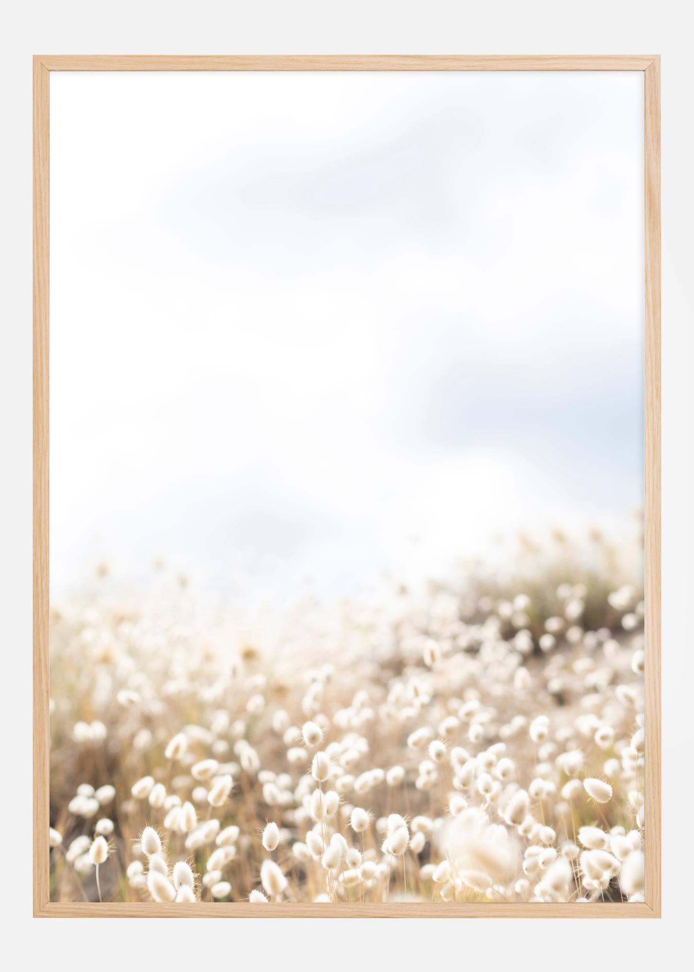 This dreamy poster captures a field full of light, fluffy flowers bathing in soft sunlight. The motif, filled with nature and tranquility, conveys a sense of warmth and calm. The white flowers' cautious heads nod in the still breeze, and the image is draped in pastel tones of yellow, beige, and white that blend with the clear blue sky.