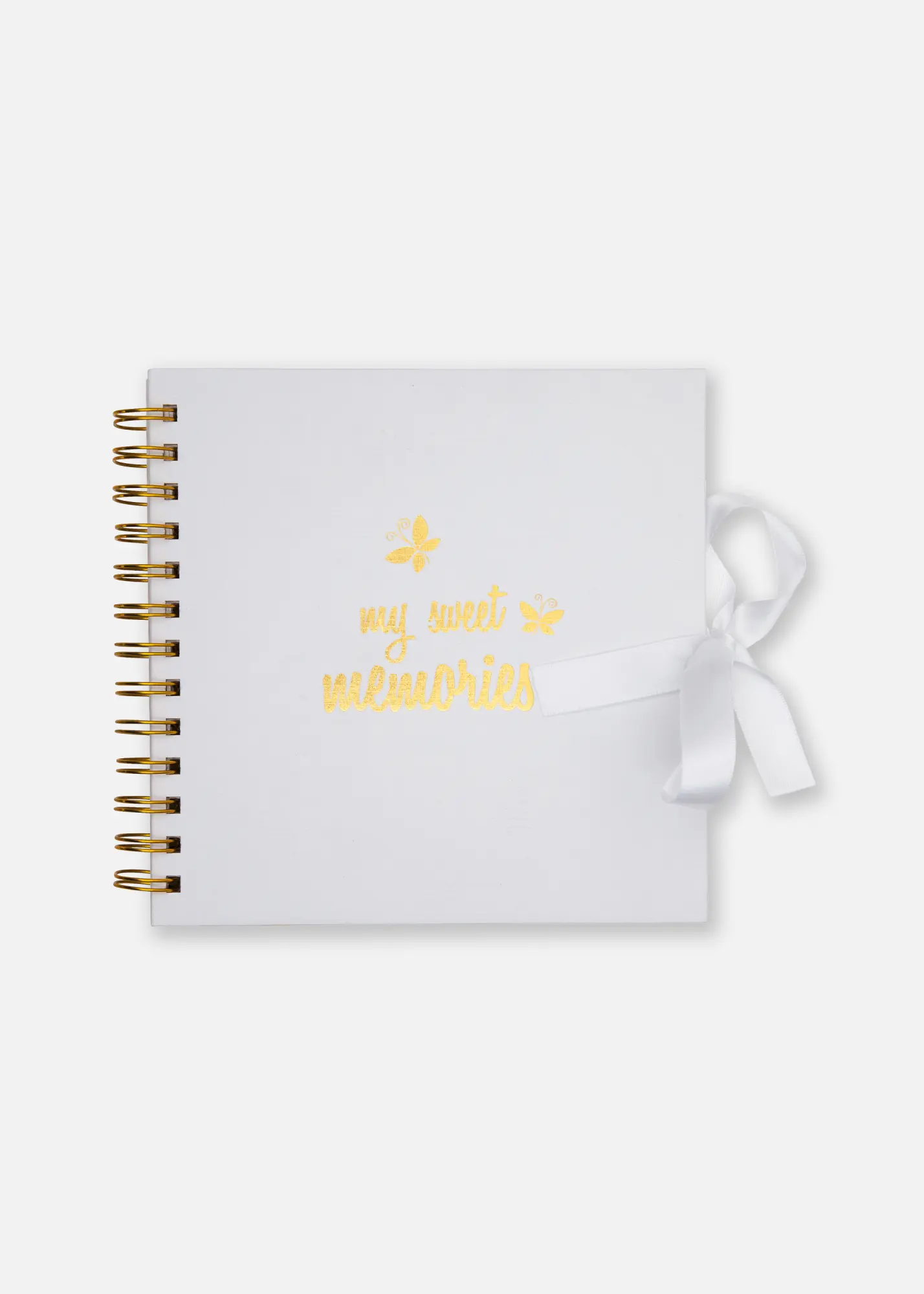 A cute spiral-bound album that you can fasten closed with white ribbons. A perfect album to keep all your best memories in! On the front, the text "My sweet memories" is printed in gold and surrounded by butterflies. The album contains 24 white, acid-free pages.