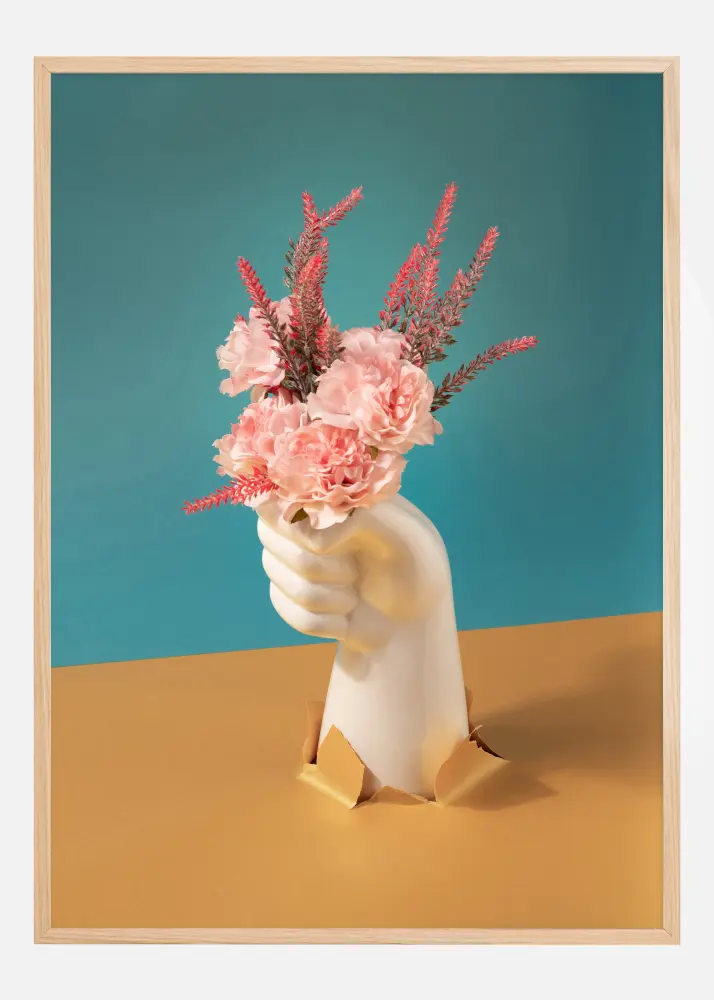 This creative and inventive poster depicts a sculptural hand holding a bouquet of blooming flowers, creating the illusion of a vase. The background in calming blue shades contrasts beautifully with the warm yellow and pink colors, creating a fresh and contemporary feeling. The split composition with the hand breaking through the yellow surface adds an element of dynamism and three-dimensional illusion to the image.