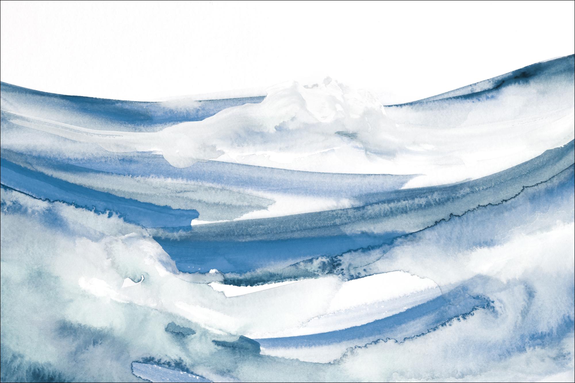 A stunning bright poster of large brush strokes of blue and white. These dramatic sweeps of colour create the illusion of waves on a sea. Soft watercolour edges create foam and add a strong feeling of action to this piece as the paint swirls about. Bring a sense of motion to your walls with this fluid piece.