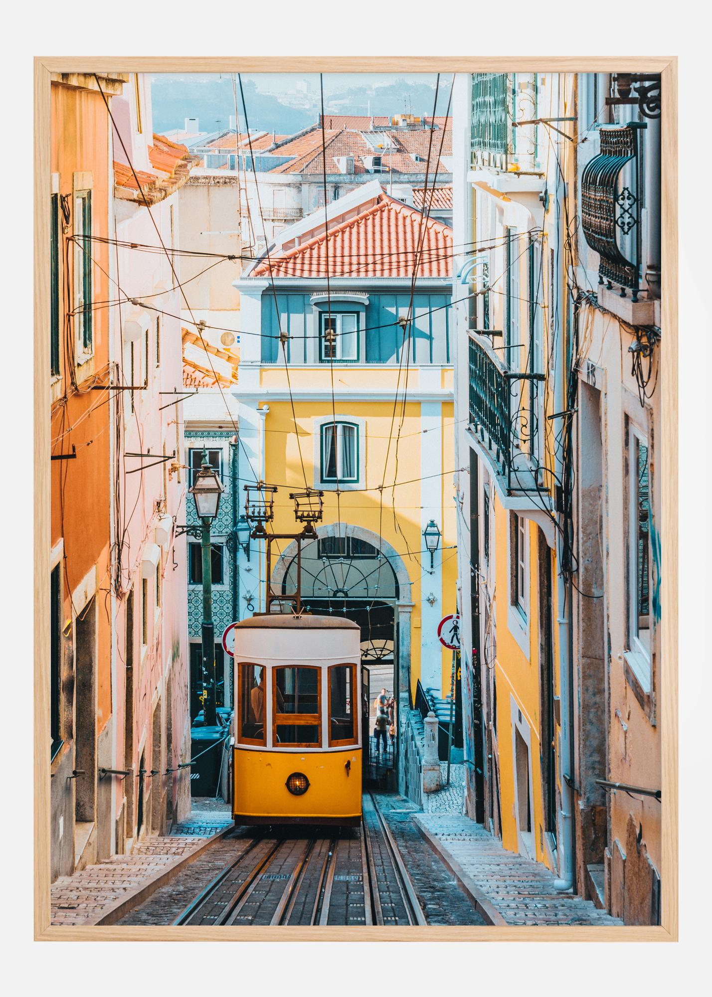 This colorful and picturesque poster depicts the charming and lively atmosphere of a European city street, full of history and everyday magic. In the foreground, we see a classic yellow tram, an iconic symbol of the city's public transport, calmly moving along the narrow streets flanked by traditional architecture in warm tones of yellow and red. This poster is like an opening to another world, inviting us to step in and discover the city's secrets.