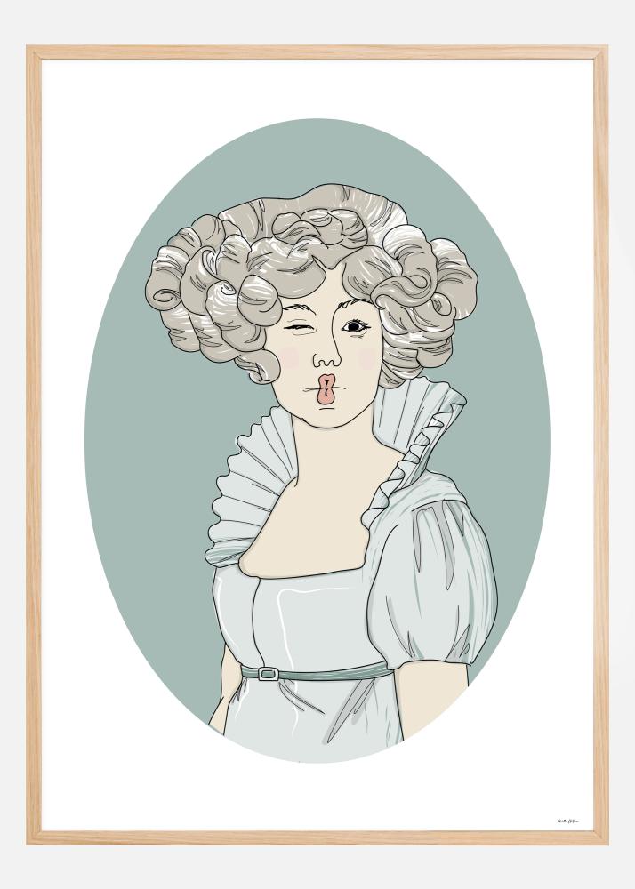 A cheeky poster of a Victorian Violetta as she casually winks out of the image, her lips puckered in a kiss. Her bouffant grey curls match with the soft blue grey dress with its high collar. The image is also in a blue oval to emulate the small locket pictures of old to create a unique, quirky art piece.