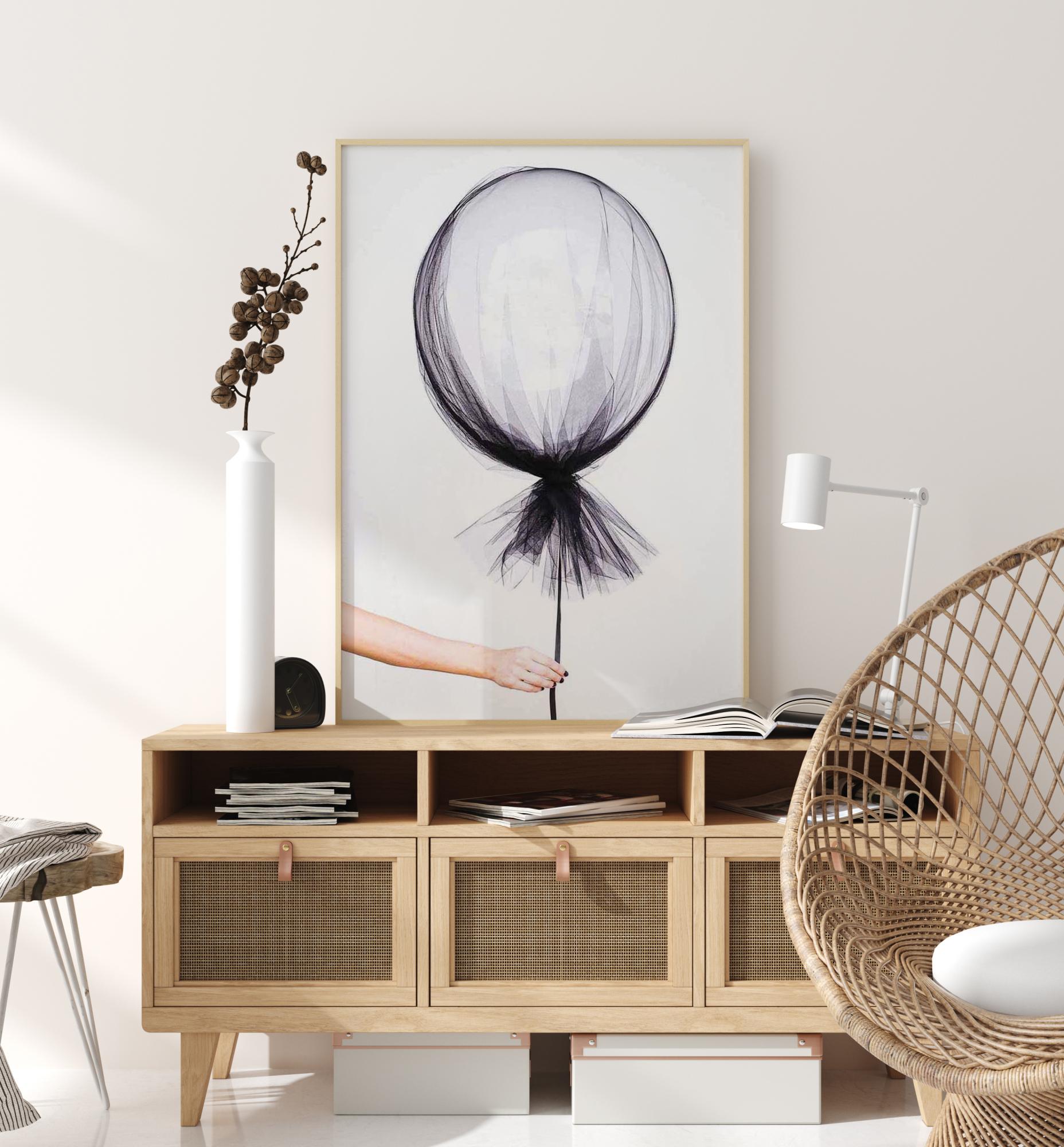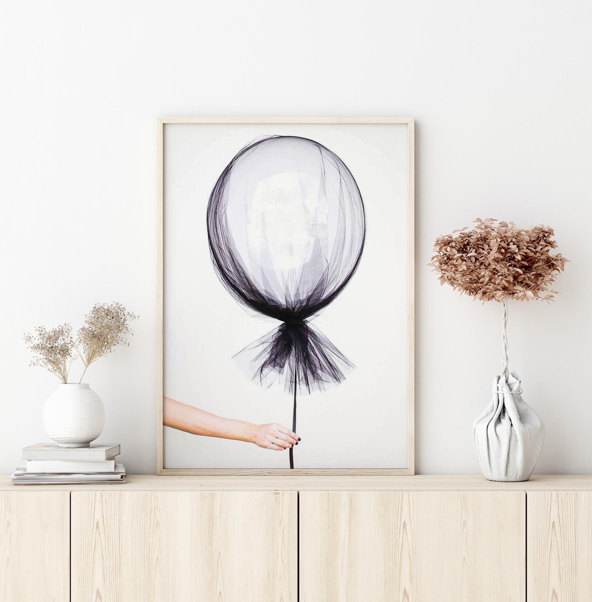 Sleek photographic art of a hand holding a floating balloon wrapped in thin transparent fabric. A charming poster that breathes a delightful mix of playful lightness and delicate fragility. Equally suitable for a child's room as for a modern home.
