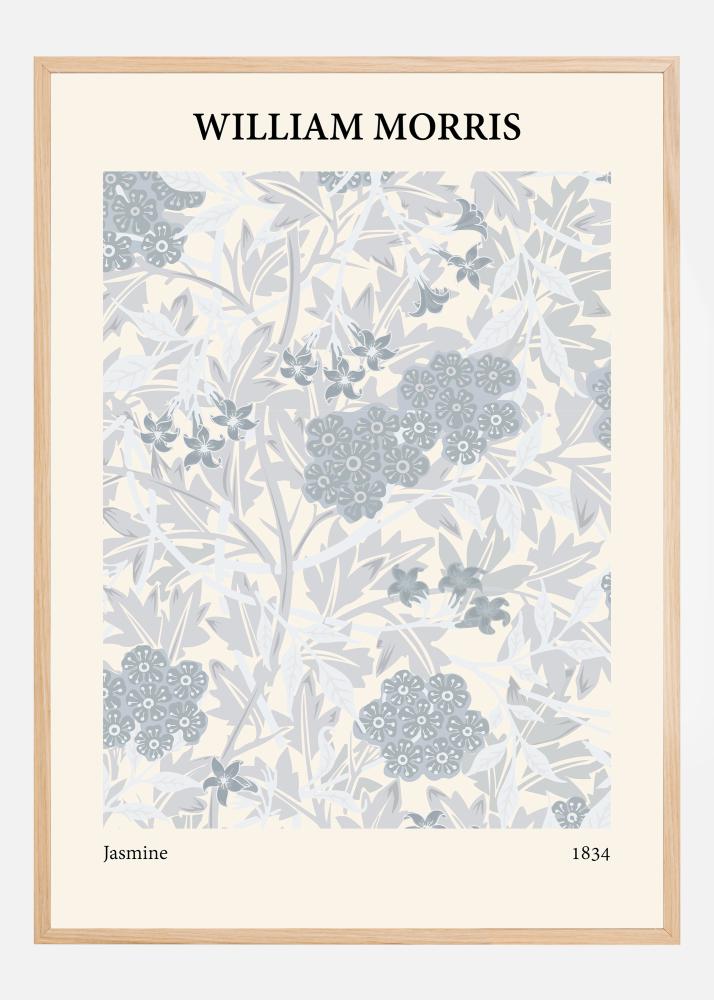 This stylish and calming poster by William Morris, titled "Jasmine", exudes a sense of tranquility and purity. The pattern is a richly nuanced interpretation of a blooming garden, with jasmine flowers and leaves in shades of pale blue and gray, beautifully set against a clear and soothing cream-colored background. This print is a tribute to Morris's love of nature and his ability to capture its beauty in his designs.