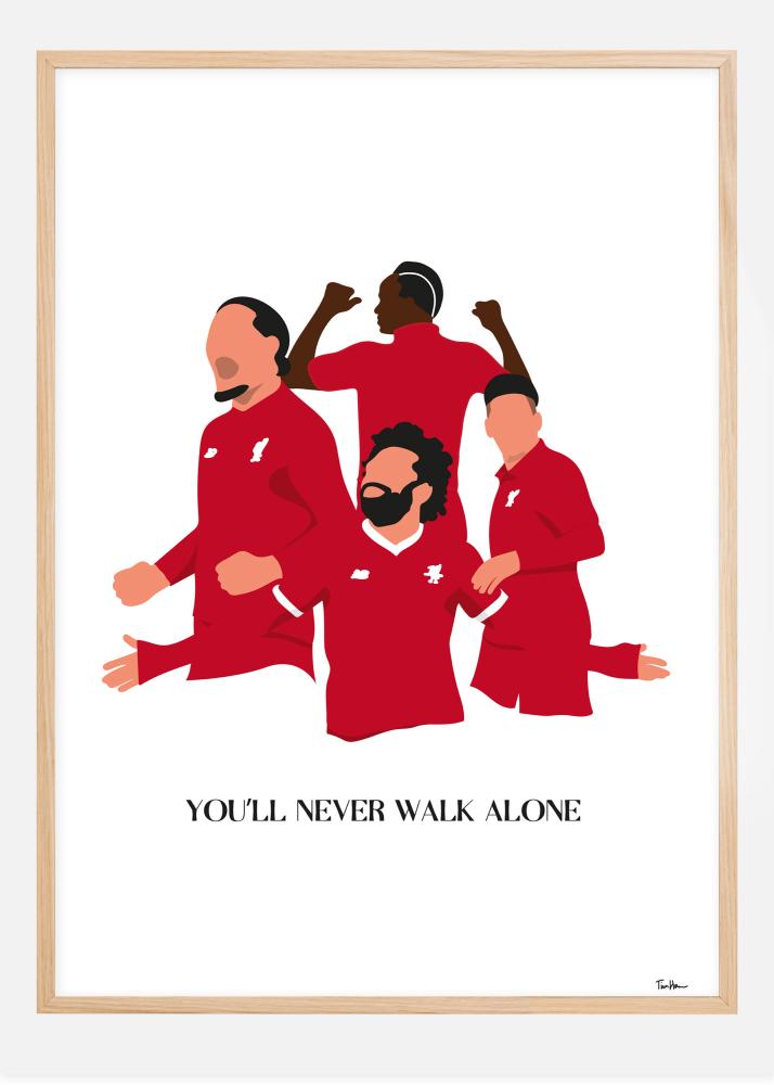 A football poster featuring four Liverpool team players in a stylised form in their red jerseys. Under the players are the words You'll Never Walk Alone, the motto of the club but also an important life quote that is perfect to get you motivated each morning.