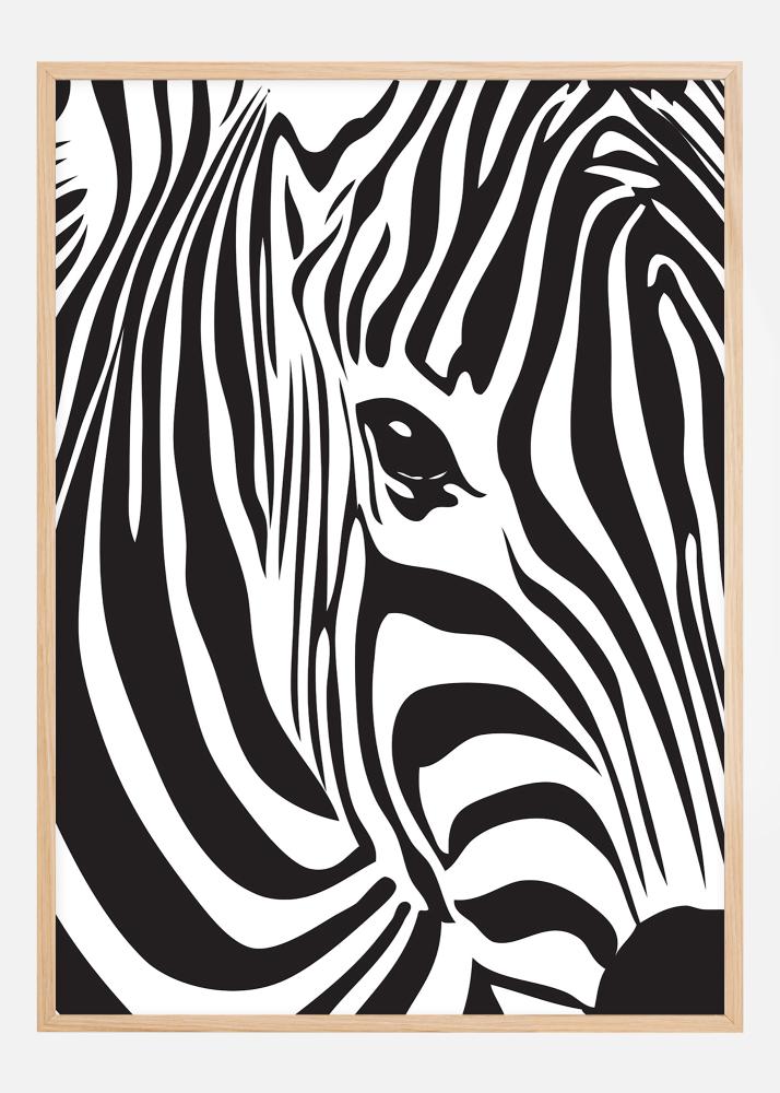 Graphic poster with a close-up of a zebra. The poster fits really well to be hung as part of a picture wall with wild animals, both in the form of illustrations and photographs, becoming a focal point in the room. The stylishly graphic black and white motif means that the poster works just as well in the home as in a public environment. Combine the print with a black picture frame with a slim profile to best highlight the zebra pattern.