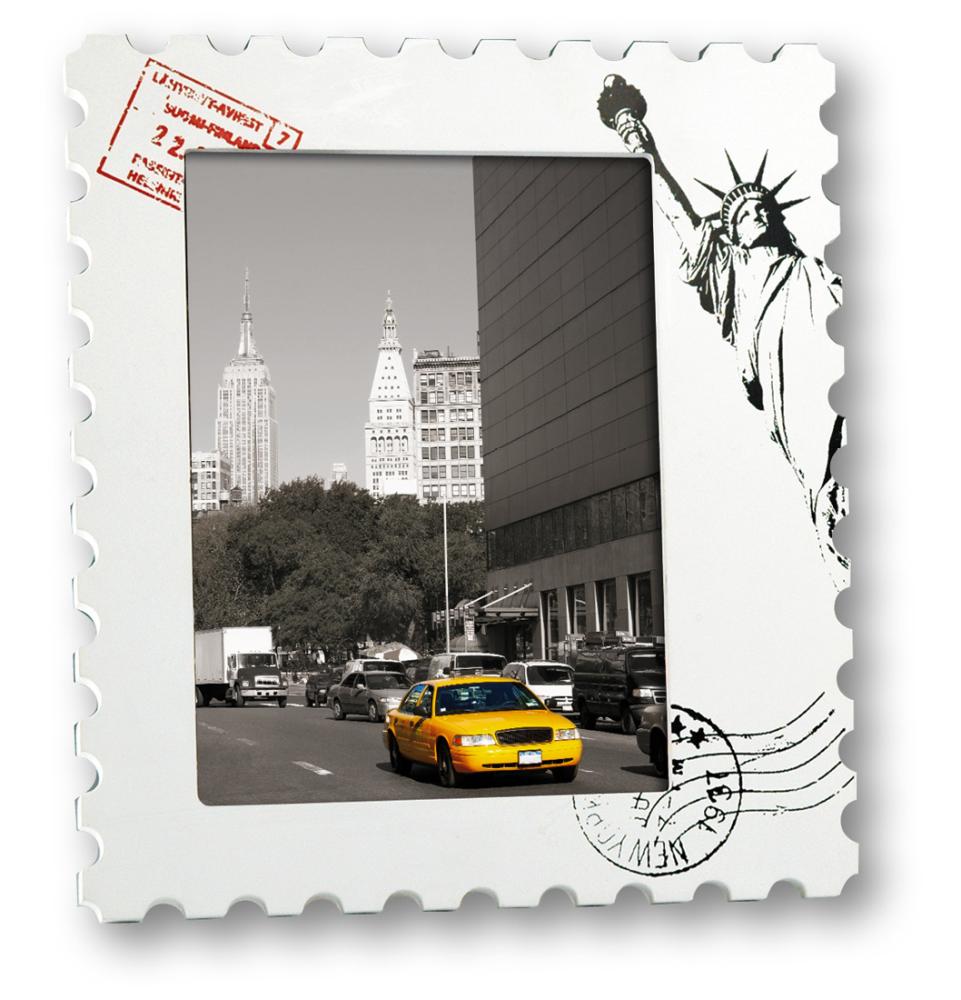 White photo frame with a shape and design inspired by a postage stamp, New York and the Statue of Liberty.