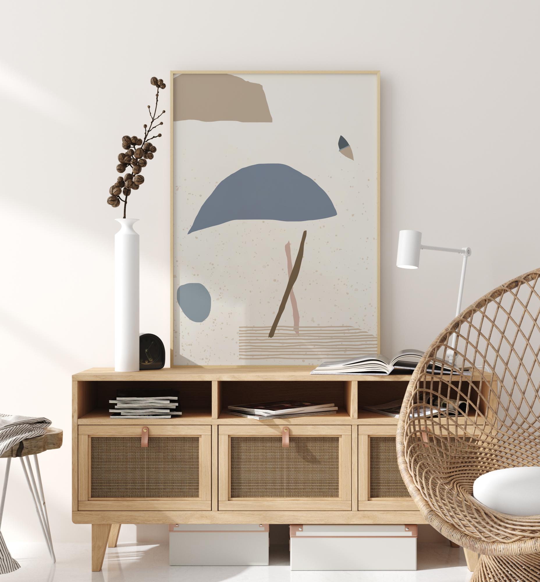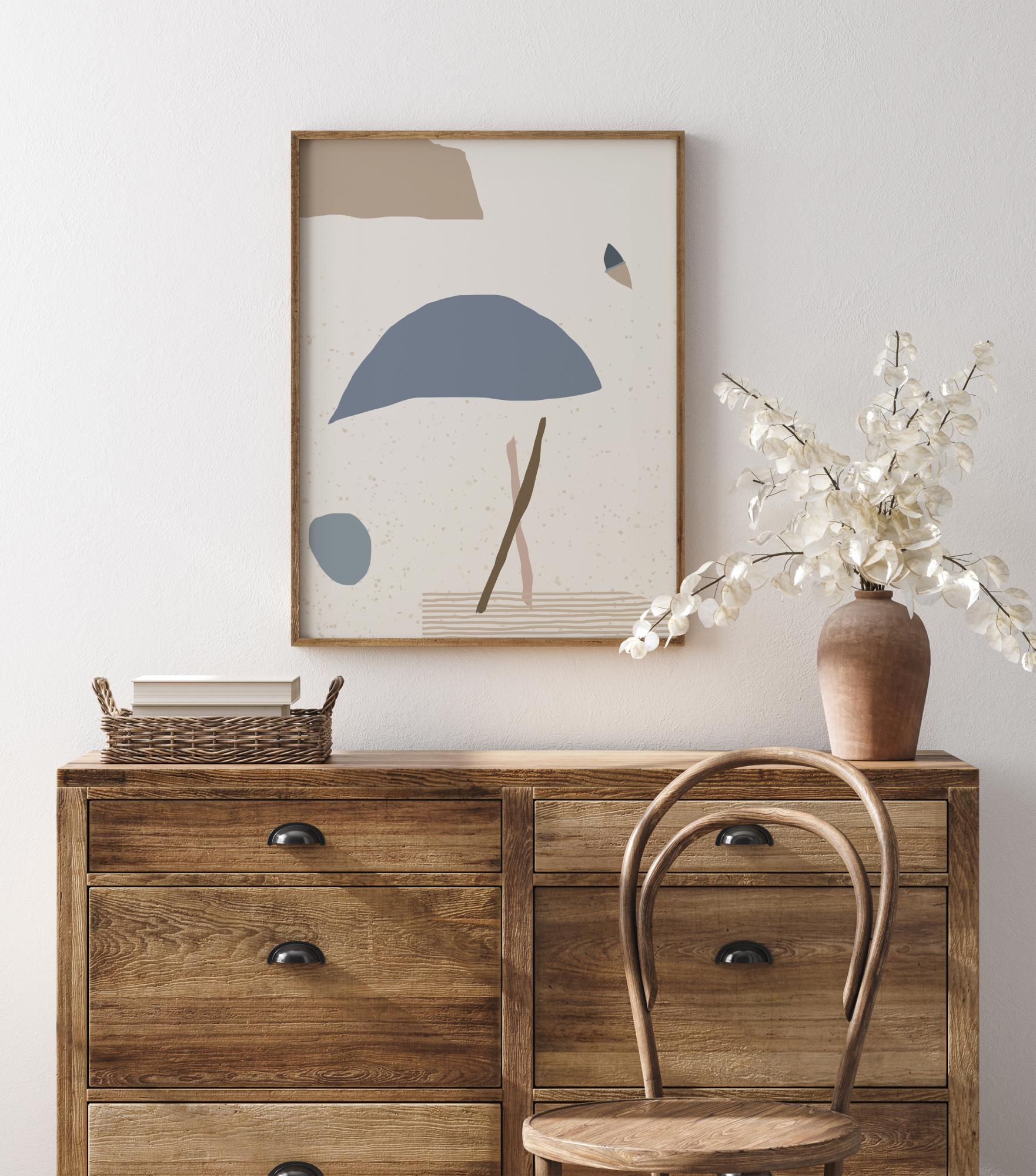 An abstract poster with blue, brown and grey shapes on a white background. See what you want to see in this minimalist piece that gives the feeling of a person, umbrella, ball, butterfly and cloud. Bring the gallery to your home with this contemplative art poster and discuss its meaning.