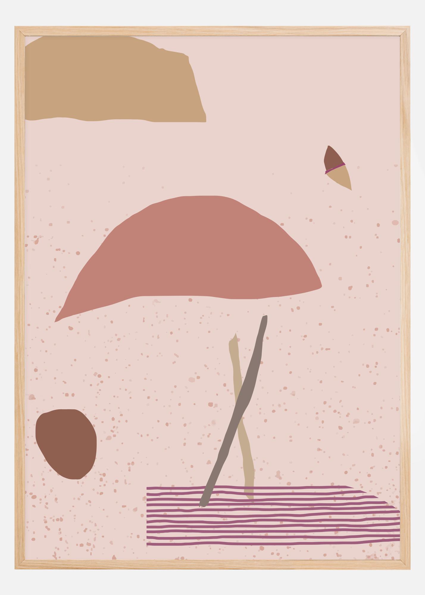 An abstract poster with red, beige, pink and purple shapes set on a soft speckled background. Enjoy the calming effect of the shapes and muse on what it means as you see a ball, cloud shape, sticks, mat or umbrella in the piece. The soft tones are perfect for a bathroom wall.
