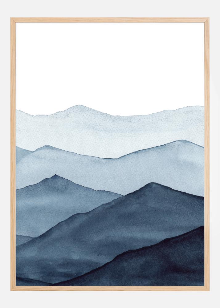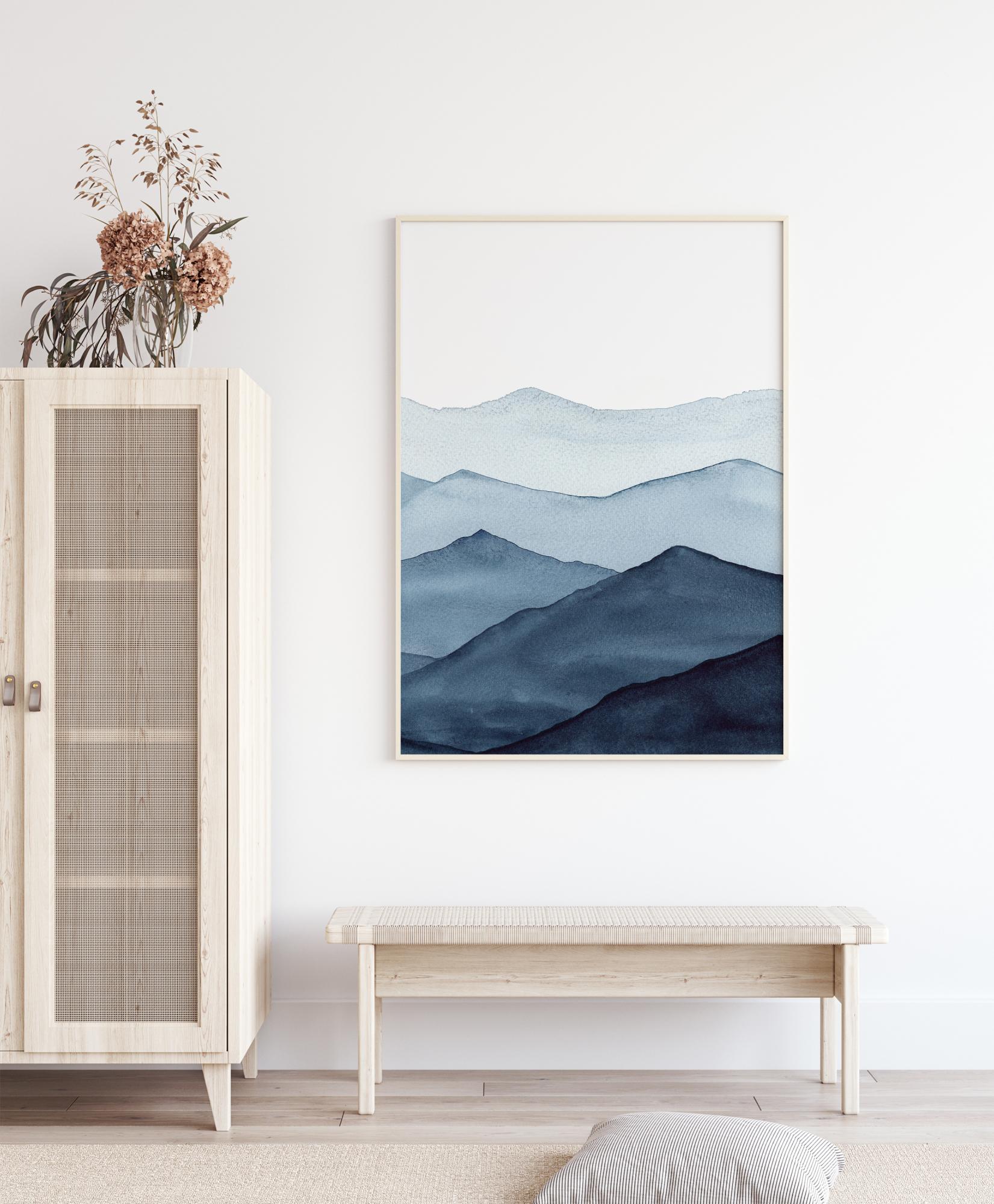 A stunning minimalist poster of a range of blue mountains. The closest mountain is a dark shade of blue with the colours becoming more washed out as the mountains fade into the distance. The soft blues are perfect to create a cool, but calming vibe as you stare into the distance.