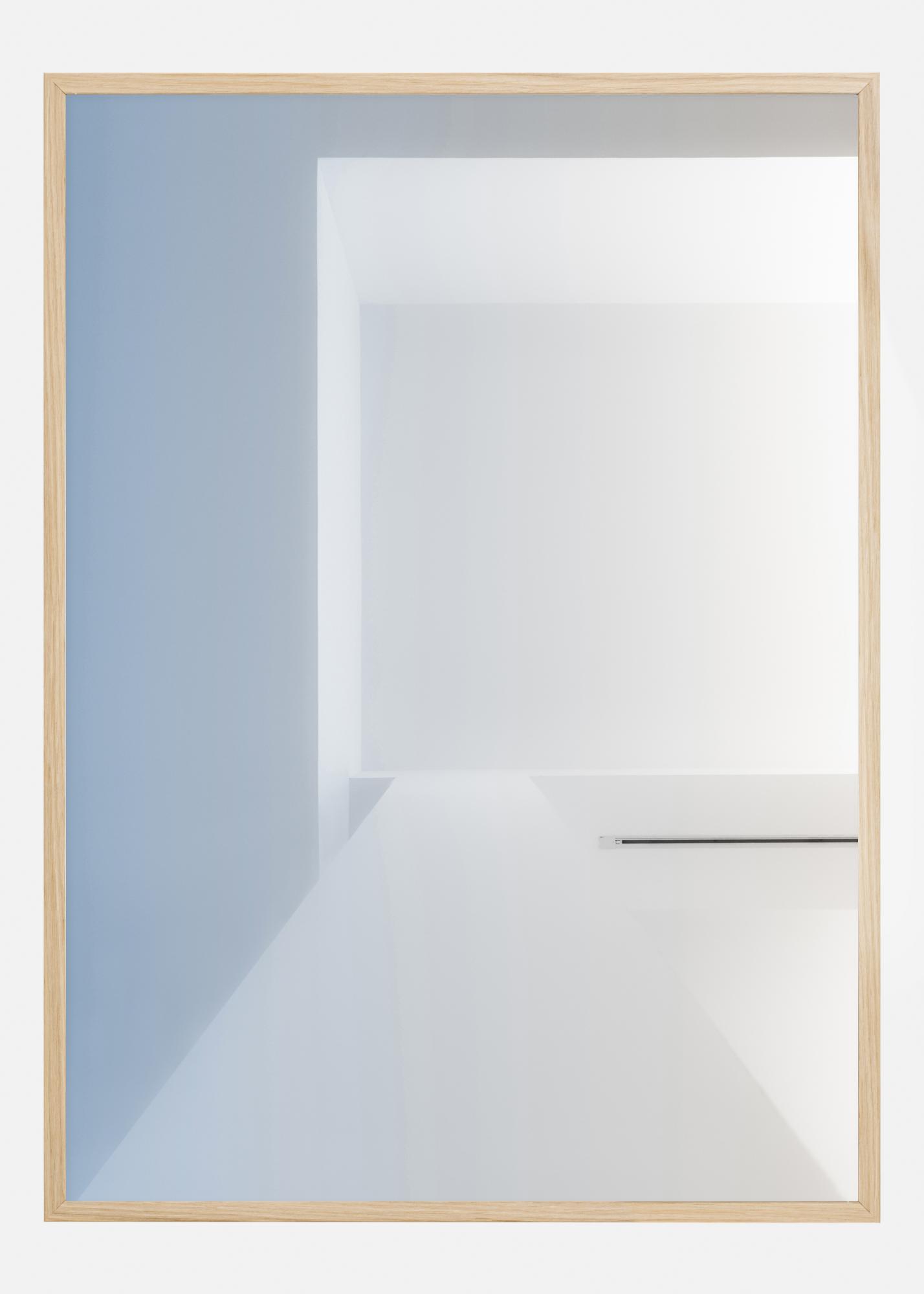 An interior abstract poster featuring calming blues and whites. The main background is a soft blue with a white square that looks like a window and countertop. A burst of softly facing white to the right feels like the sun bursting through for a splash of tranquillity in your house.