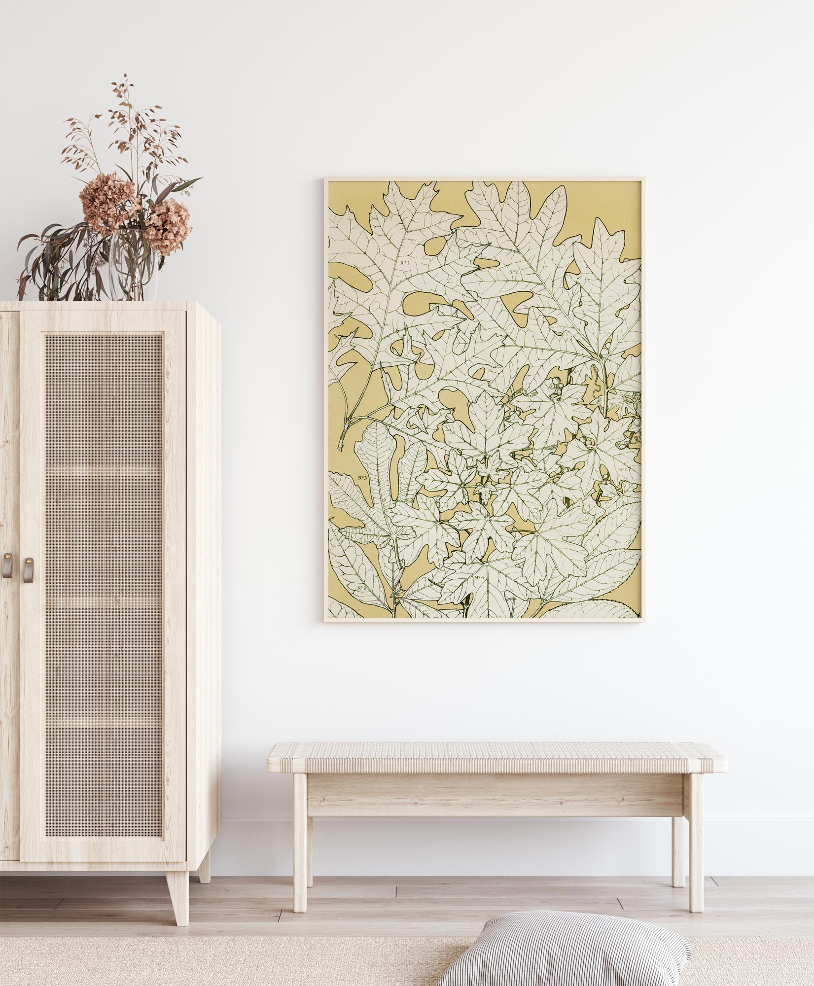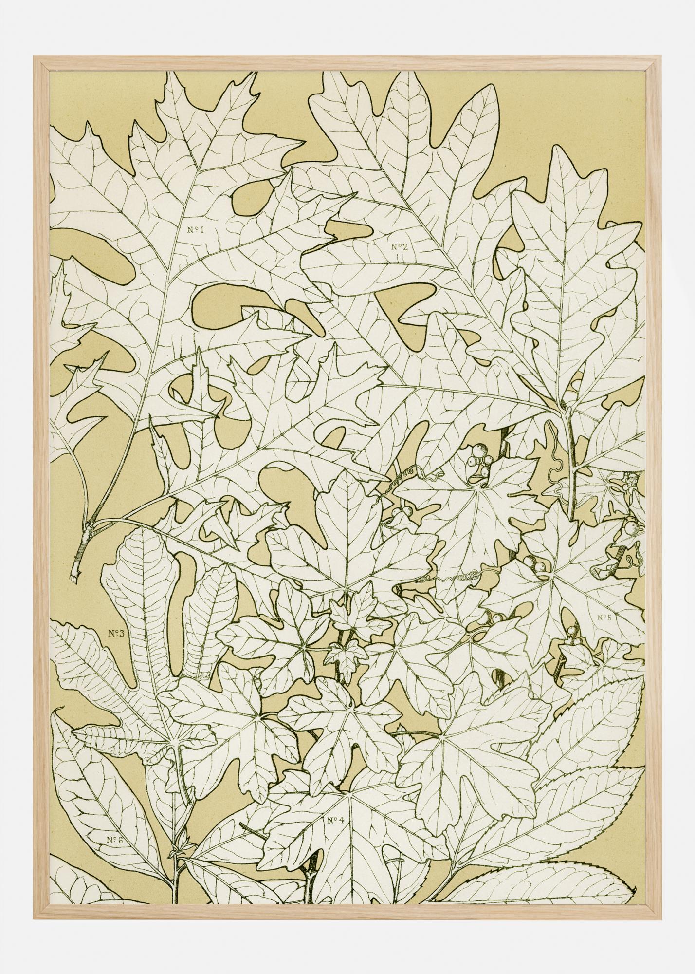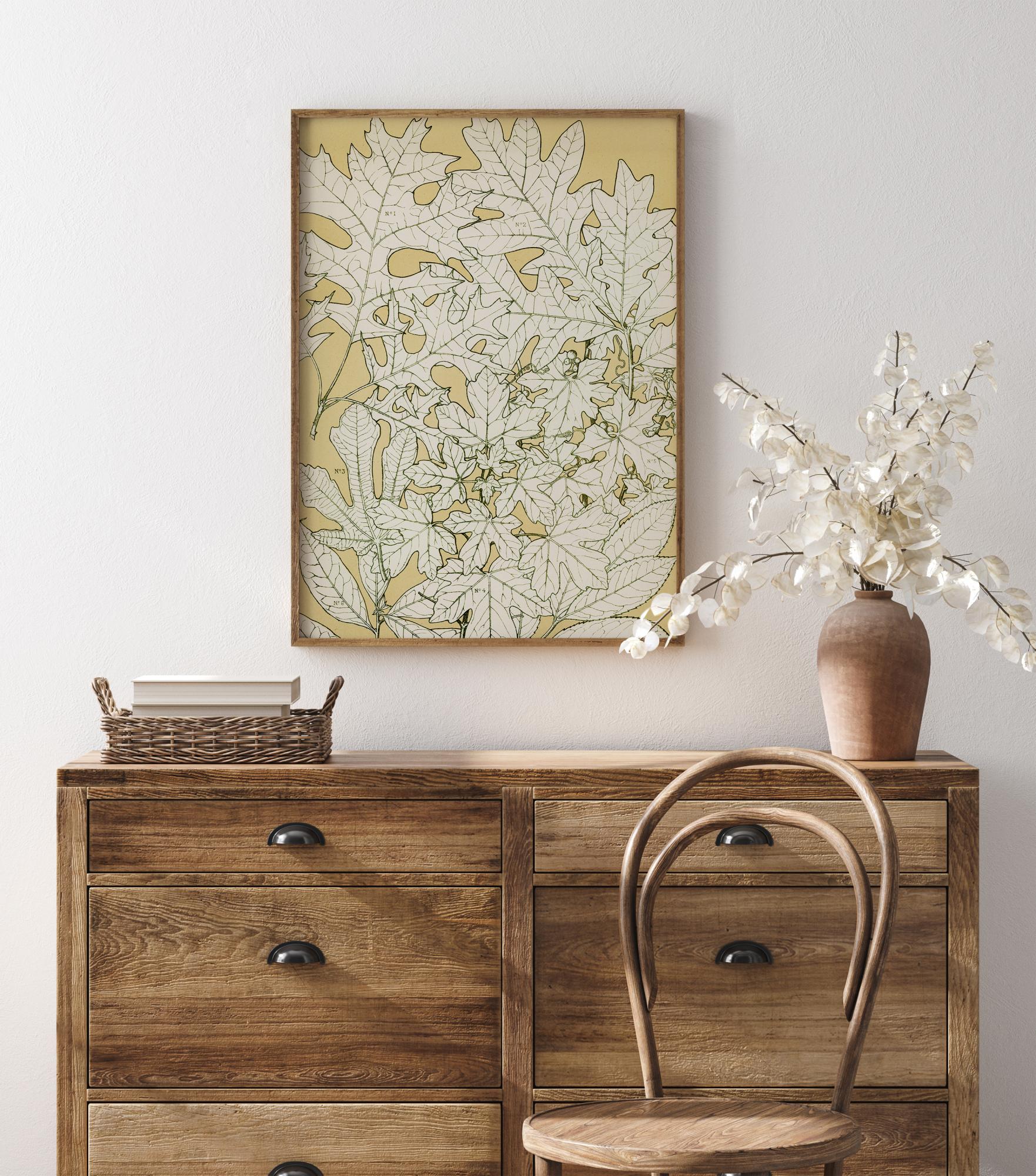 An abstract leaf poster with simple drawn leaves on a pale gold background. Various leaves are carefully drawn complete with their veins and stalks. The lack of colour makes them pop against the solid background showing their details. Add this to a simple wall for a natural feel in your home.