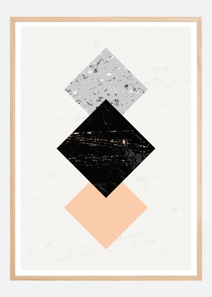 A geometric poster with three different coloured squares. A softer piece, the focus is a dark black square, but this is softened by a blue square above, and a pink square below each with additional patterns. Add drama without being overpowering when you hang this in your hall or any room with natural light.