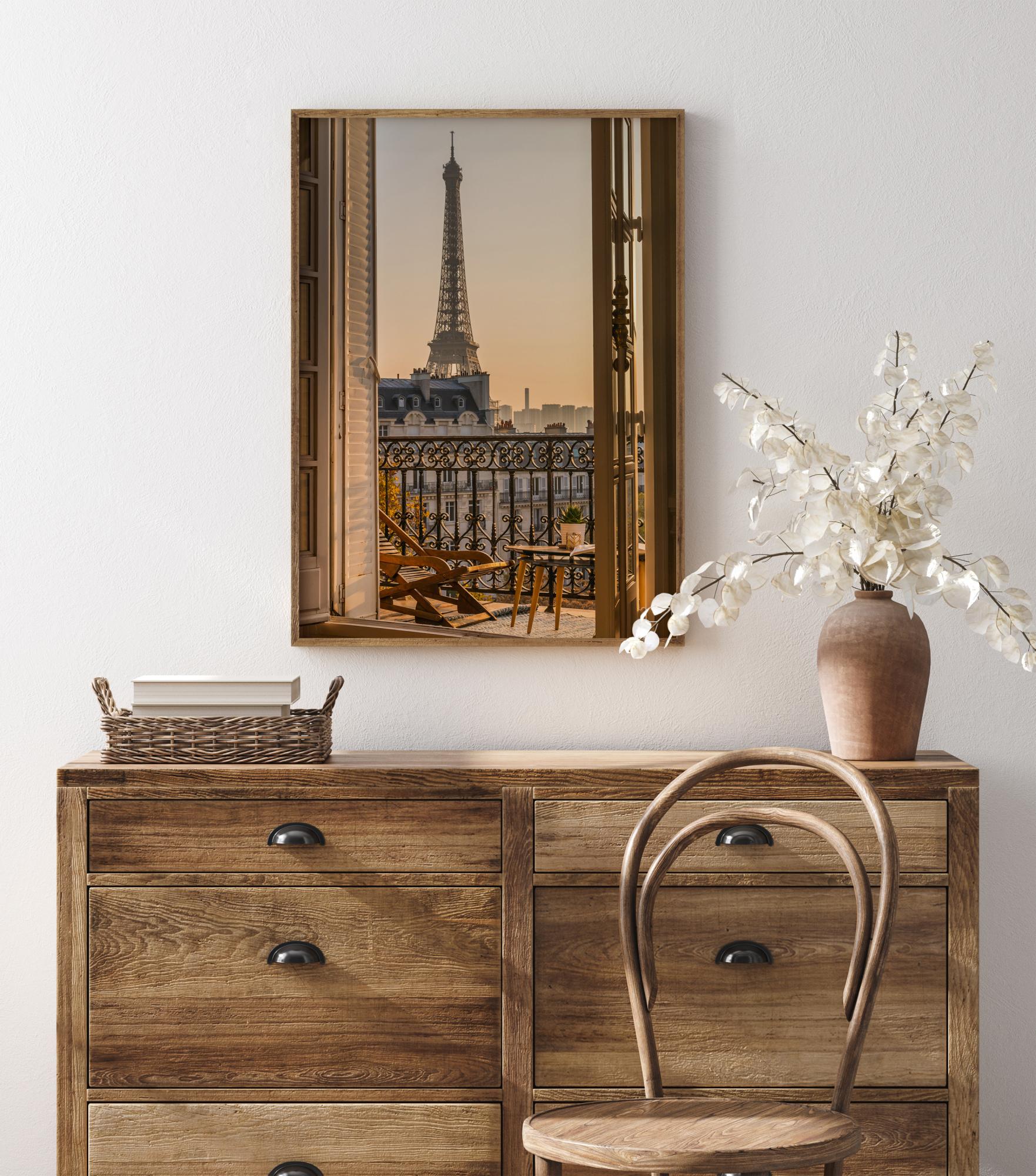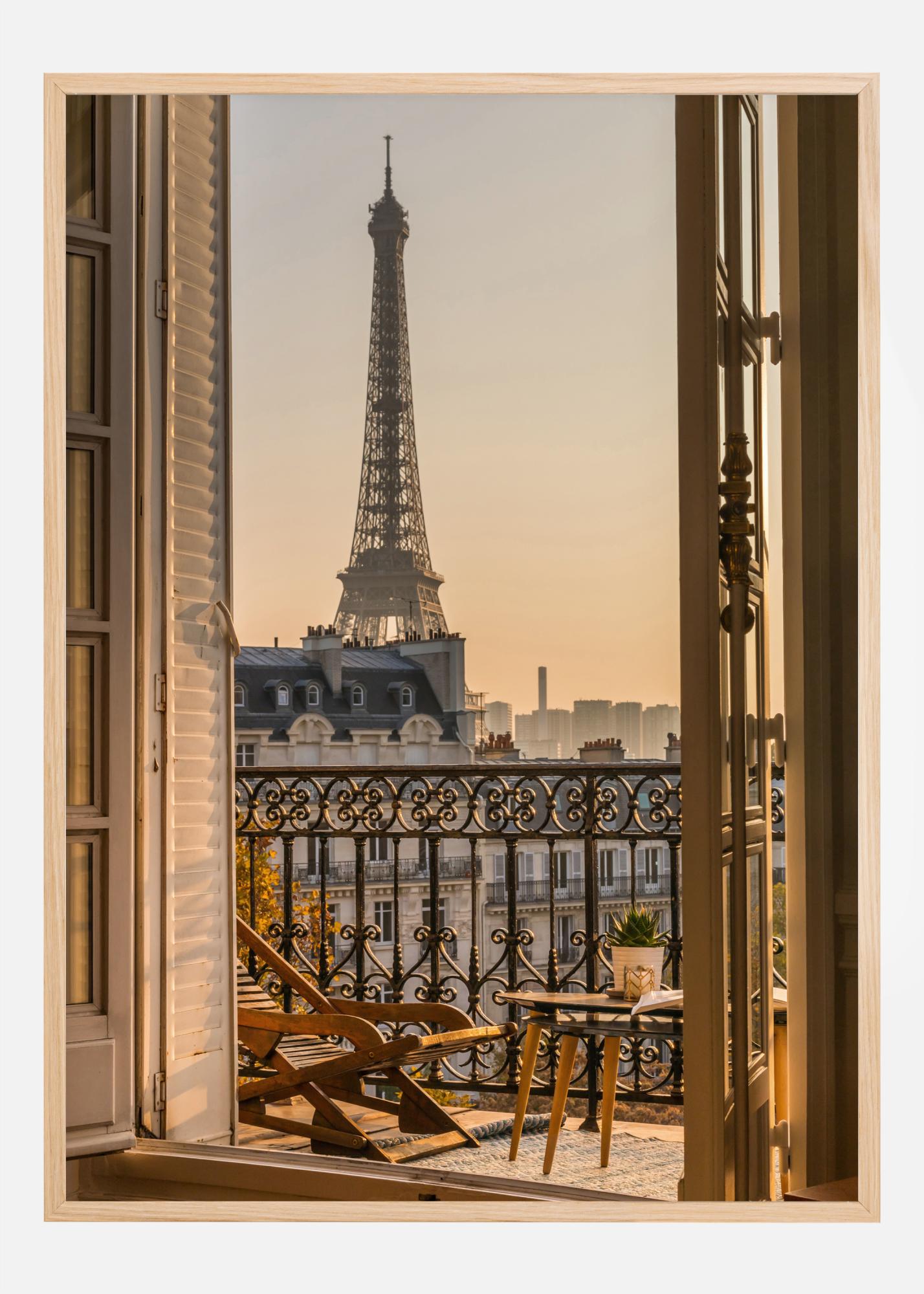 A beautiful cityscape poster showing the Eiffel Tower in the distance. An ornate balcony is the setting for this shot with a soft morning light covering the chair and railings. The tower stands tall and draws the eye in. You can almost feel the cool breeze through the open doors.