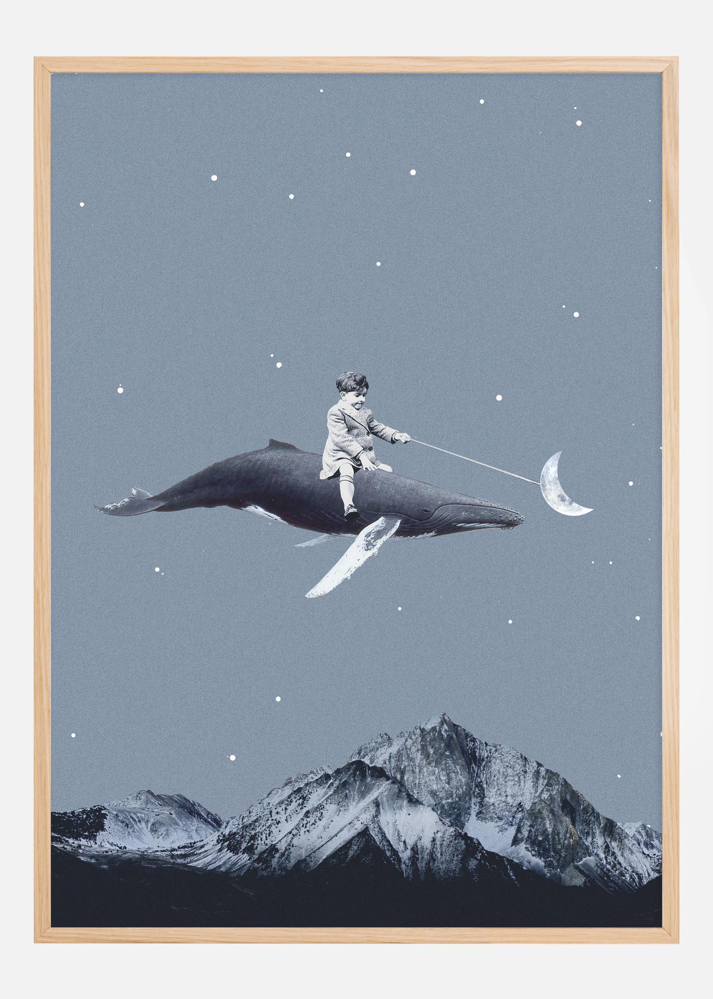 This creative and inspiring poster depicts a young explorer riding a whale capturing the moon on a stick. It symbolizes the pursuit and dream of achieving what seems to be impossible. The starry skies and the rugged mountain terrain below provide a sense of adventure and exploration into the great unknown.
