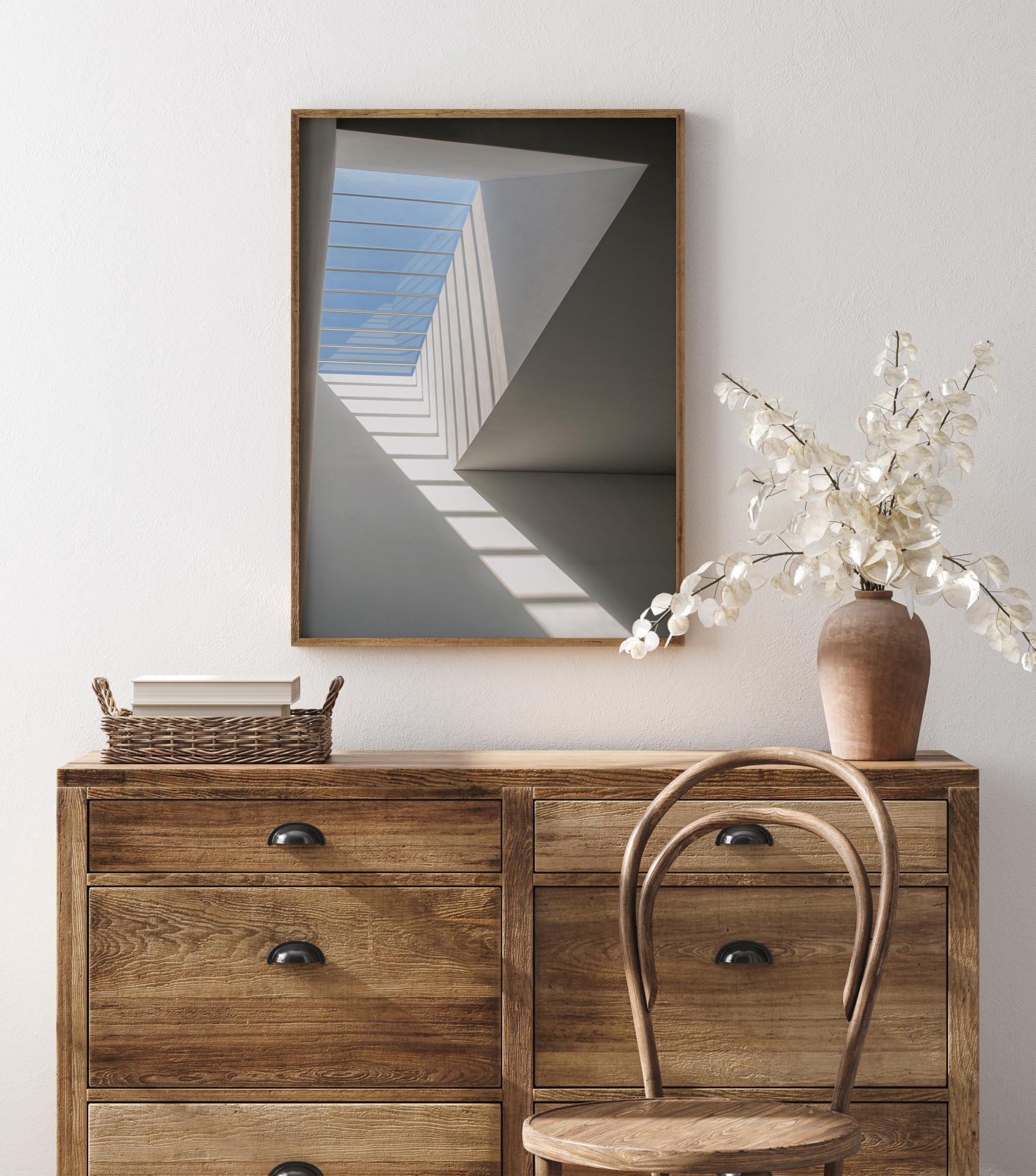A simple airy poster of a bright white room interior. A dormer window sits to the left where blue sky can be seen. The light streaming through casts shadows that look like a ladder leading the eye up to that light outdoors. Add brightness to a dark room with this peaceful image.