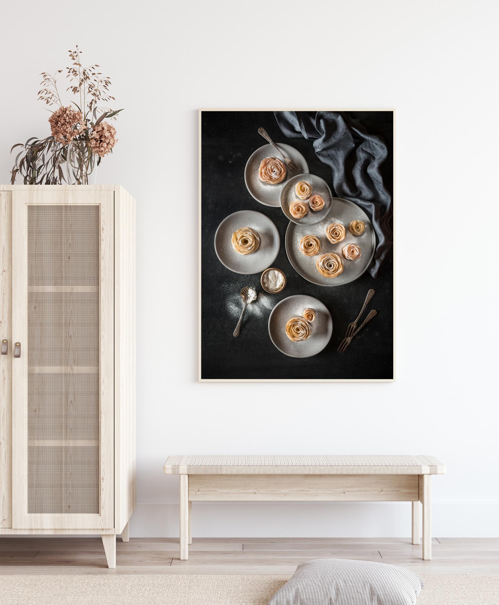 A simple dinnertime poster complete with trays of different sweet pastries. This apple tartlets are incredibly delicate, each one dusted in sugar and shaped like a fragile rose. The white plates and crusty golden pastry stand out against the black tablecloth. You'll feel ready for something sweet with this at home.