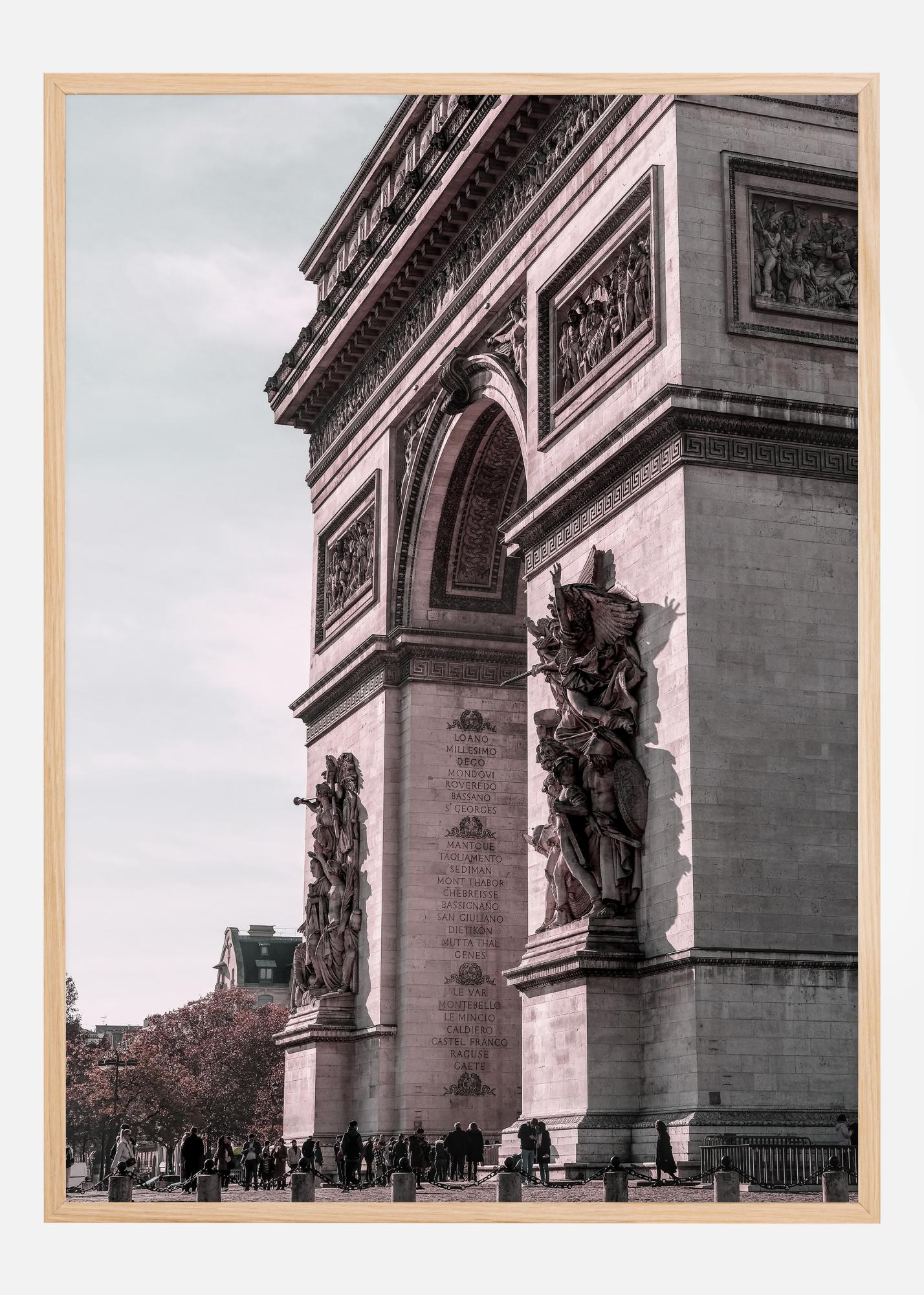 This elegant poster highlights the majestic and detailed architecture of the Arc de Triomphe in Paris. In this unique print, the grandeur and detail of the famous landmark are captured, from the mighty sculptures adorning its pillars to the fine embellishments and inscriptions that speak of its historical significance. With a slightly pink tone that creates a warm atmosphere, this image is a tribute to French history and architecture, and becomes a cultured addition to any collection of art and posters.