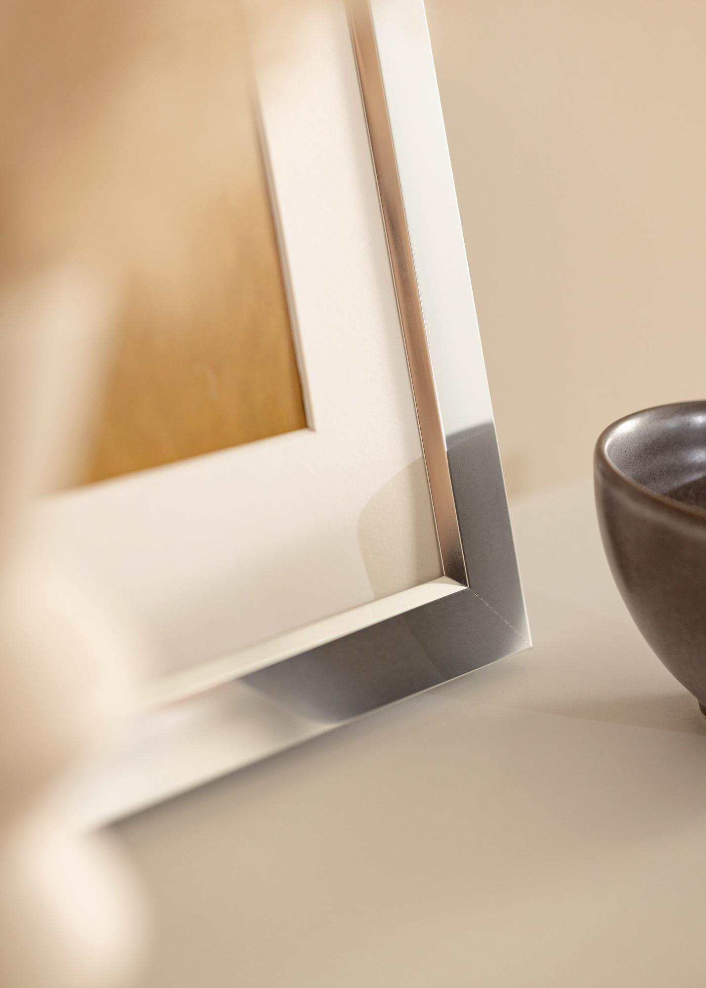 Stylish high-quality, shiny silver aluminium picture frame made in Germany with a mirror glass feel. The high-gloss look attracts the eye and reflects the light in a beautiful way while drawing focus to the subject of the picture. The frame's minimalist design language means it fits nicely into modern interiors, but it can also be a nice accent piece in rooms of other interior design styles. Complete the frame with a mount to get the picture looking just right.