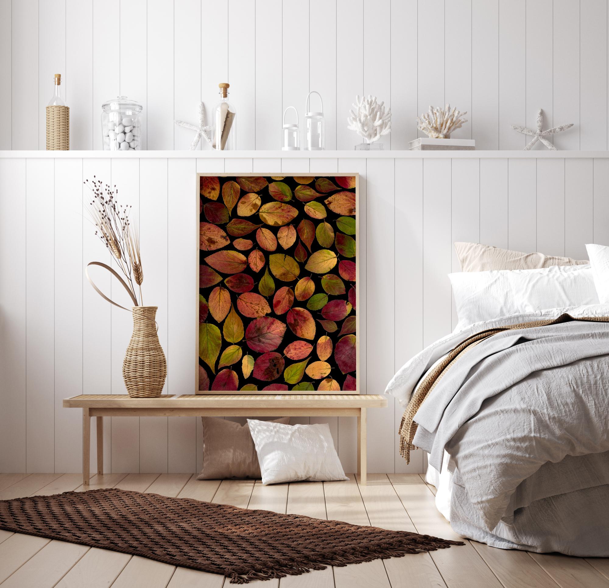 A patterned poster of autumnal leaves. An array of yellow, pink, red colours greet the eye in this organized leaf collection. The leaves all fit together on a dark background bringing the vibrancy of Fall into this poster. Perfect for a splash of colour in your kitchen or the hallway.