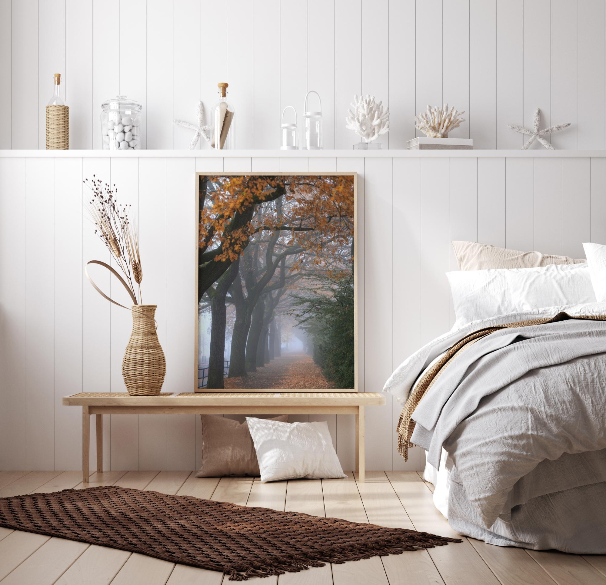 A dramatic nature poster of a path past tall mature trees. On the left, thick tree trunks and orange leaves reach the sky. To the right, green coniferous trees contrast with the red deciduous leaves. Mist emanates from the distance creating a cooler feel bringing the grandeur of nature to your home.