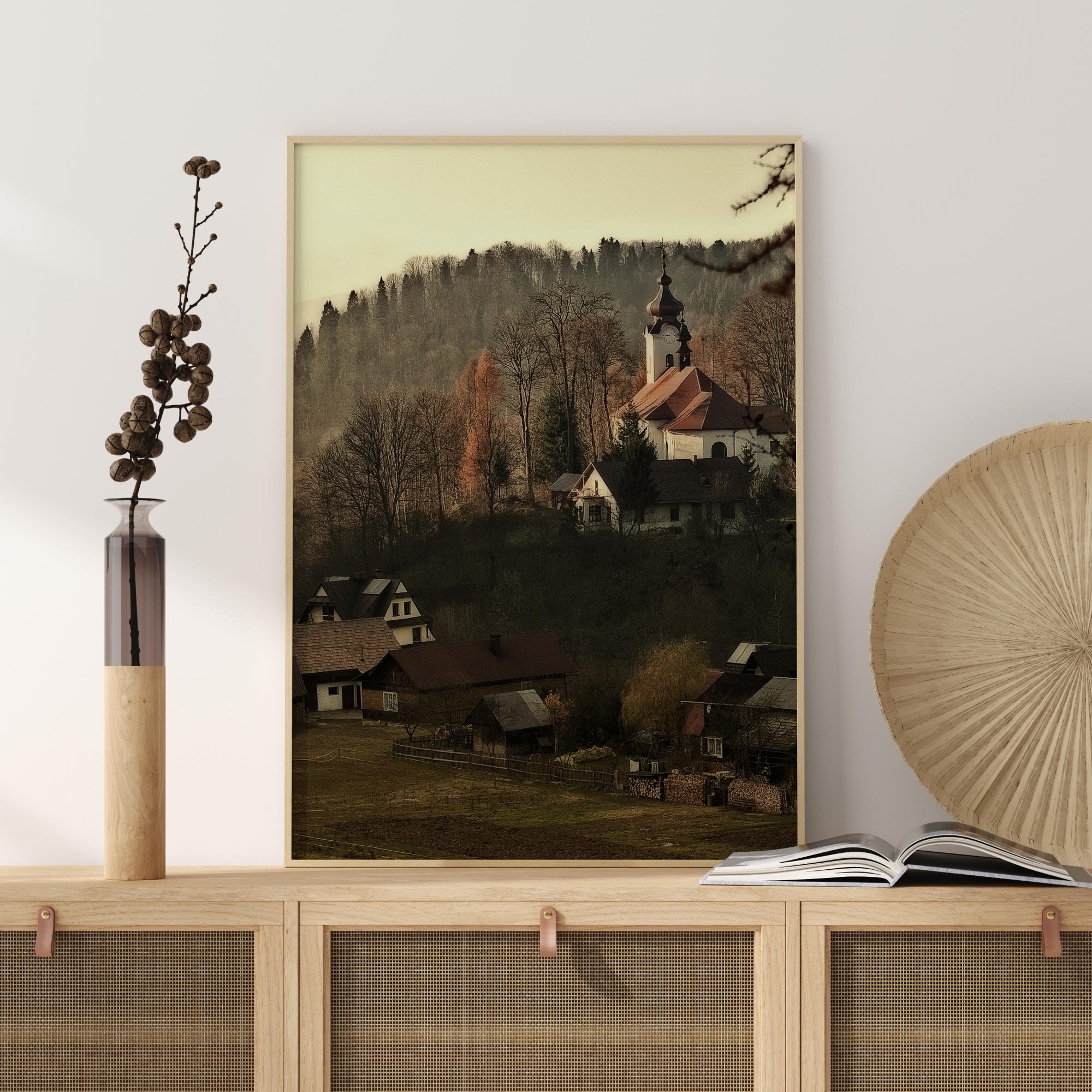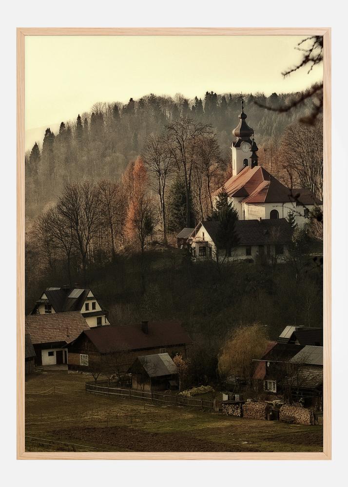 A townscape poster of a small rural village with old houses and fields with tree covered hills behind. A white church tower stands tall against the muted browns and greens of the landscape. Immerse yourself and your imagination in this quaint village when you add this poster to your wall.