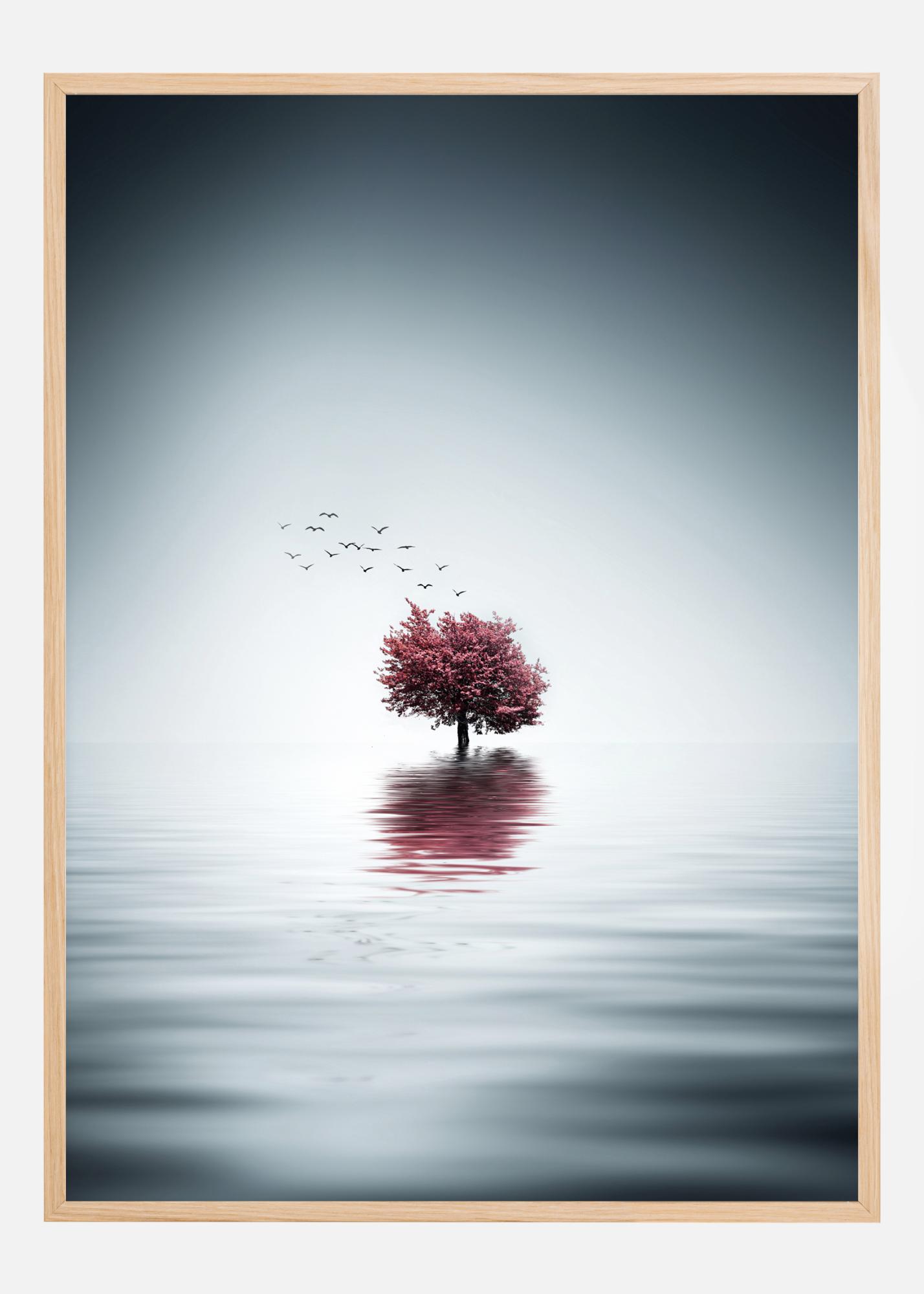 A simple nature poster of a lack with a solitary tree in the middle. The strong colours and ripples lead the eye to the small bright pink cherry blossom tree. A flock of birds fly away in a halo of light. You can feel the mysterious nature of this world.