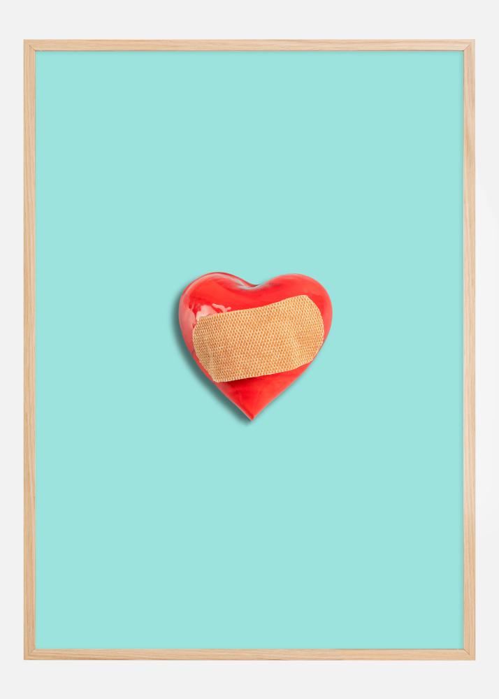 This thought-provoking poster shows a red heart with a bandage on it, against a calming turquoise background. The symbolism is strong and open to interpretation, whether it concerns healing a broken heart or taking care of our emotional wounds. The vivid contrast between the red heart and the soothing background gives the image a deep and emotional resonance.