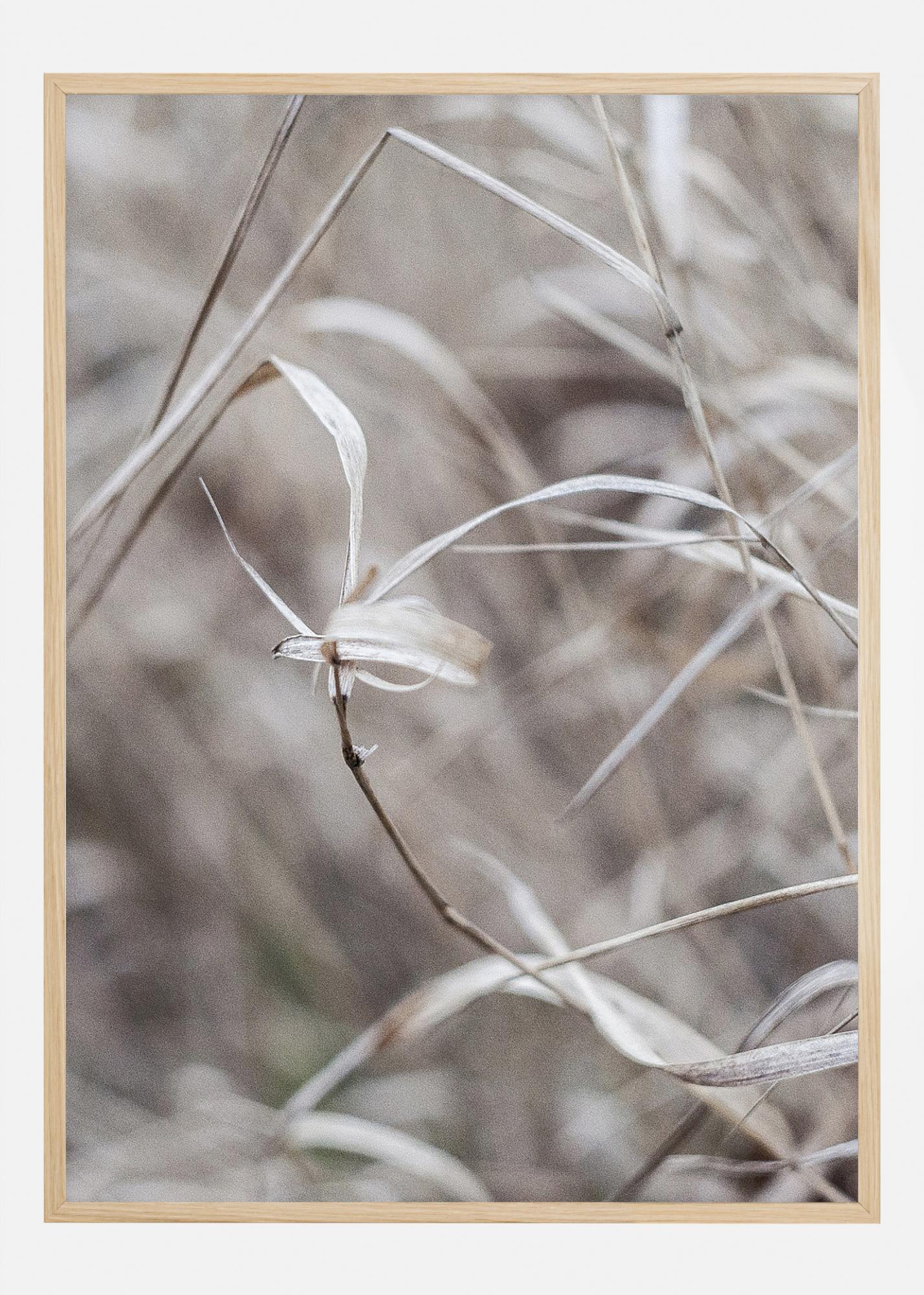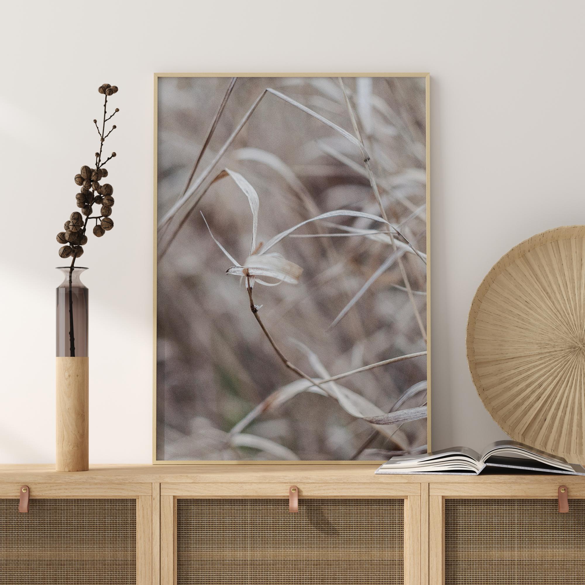 An elegant nature poster of soft leaves in close-up. The gentle stalks and leaves lead the eye around the piece. A sense of depth is added with the out of focus backdrop. Put this on a bright block colour wall to make those soft neutral pastels really stand out.