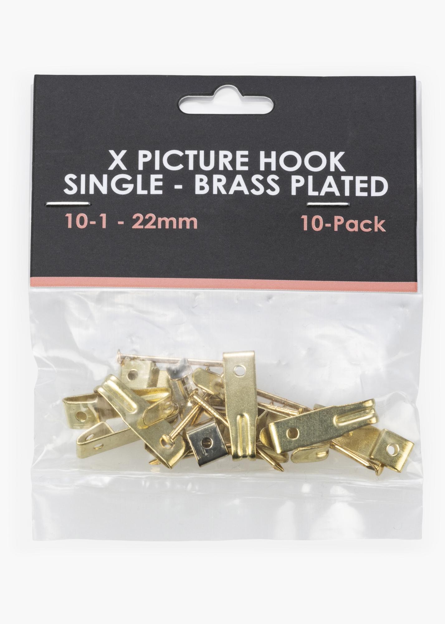 X-hook for mounting on a wooden or plasterboard walls. Can take loads of up to 5 kg. Brass coloured.