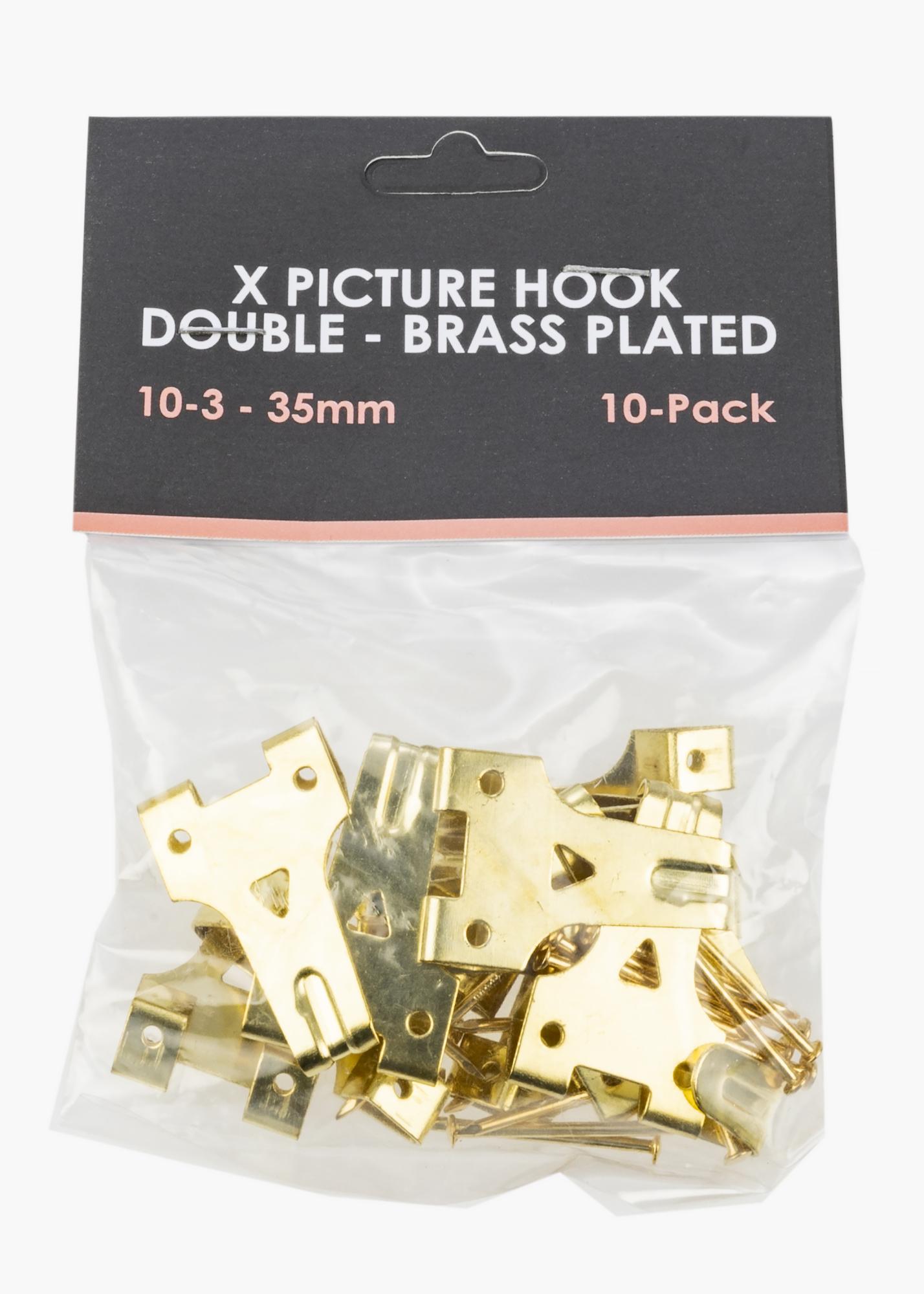 Double X-hook for mounting on a wooden or plasterboard walls. Can take loads of up to 10 kg. Brass coloured.