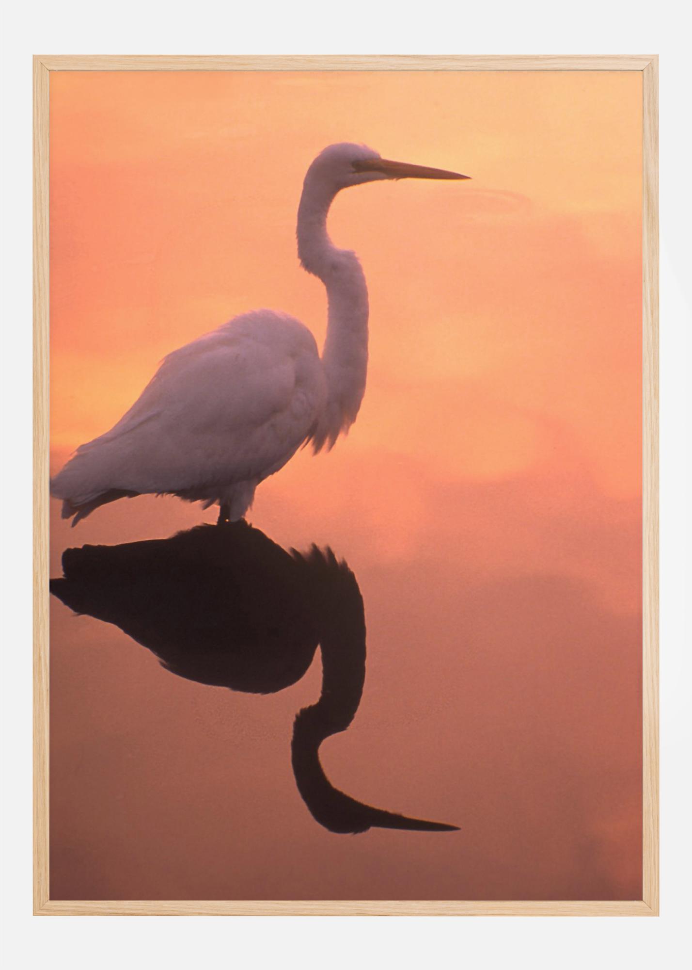 A wildlife poster of a white stork against a stunning orange sky. The simple reflection of the stork in the water sees the sky perfectly mirrored as well. The soft orange and yellow palette is the perfect way to add warmth and peace to your home.