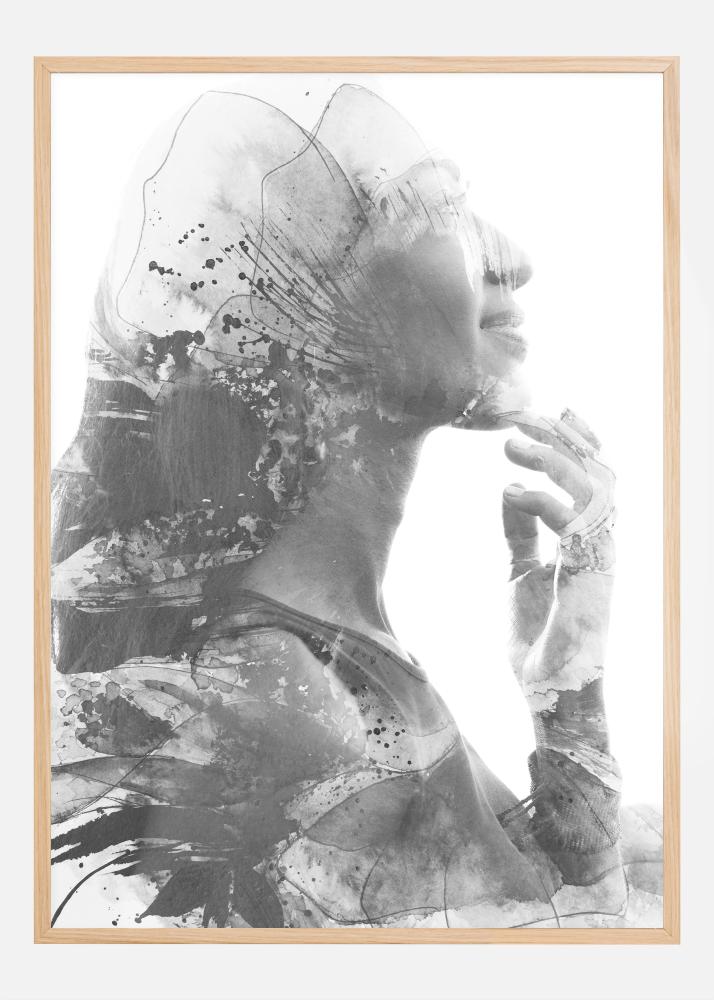 This artistic poster depicts a double exposure image of a woman in profile, whose form merges with abstract ink splashes and watercolor patterns in a black and white palette. The image is a captivating fusion of human and art, capturing the beauty of female contemplation and the ephemeral nature of creativity. This artwork would make a bold and thought-provoking addition to any modern interior.