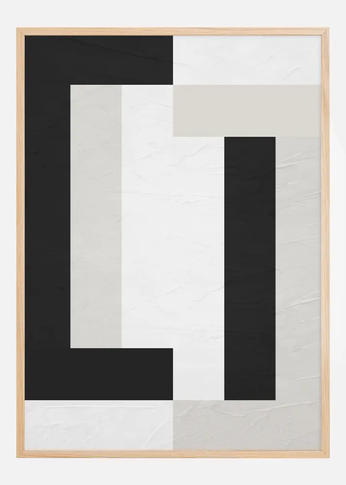 This distinctive poster combines the simplicity of modern art with a bold geometric design. The contrasting play between black and white is divided into rectangular blocks and lines, creating a sense of balance and asymmetry. Ideal for those who appreciate strong visual expressions, this print fits perfectly in a minimalist or contemporary home. It offers a stylish simplicity that can become the focal point of the room or contribute to a larger, more complex composition.